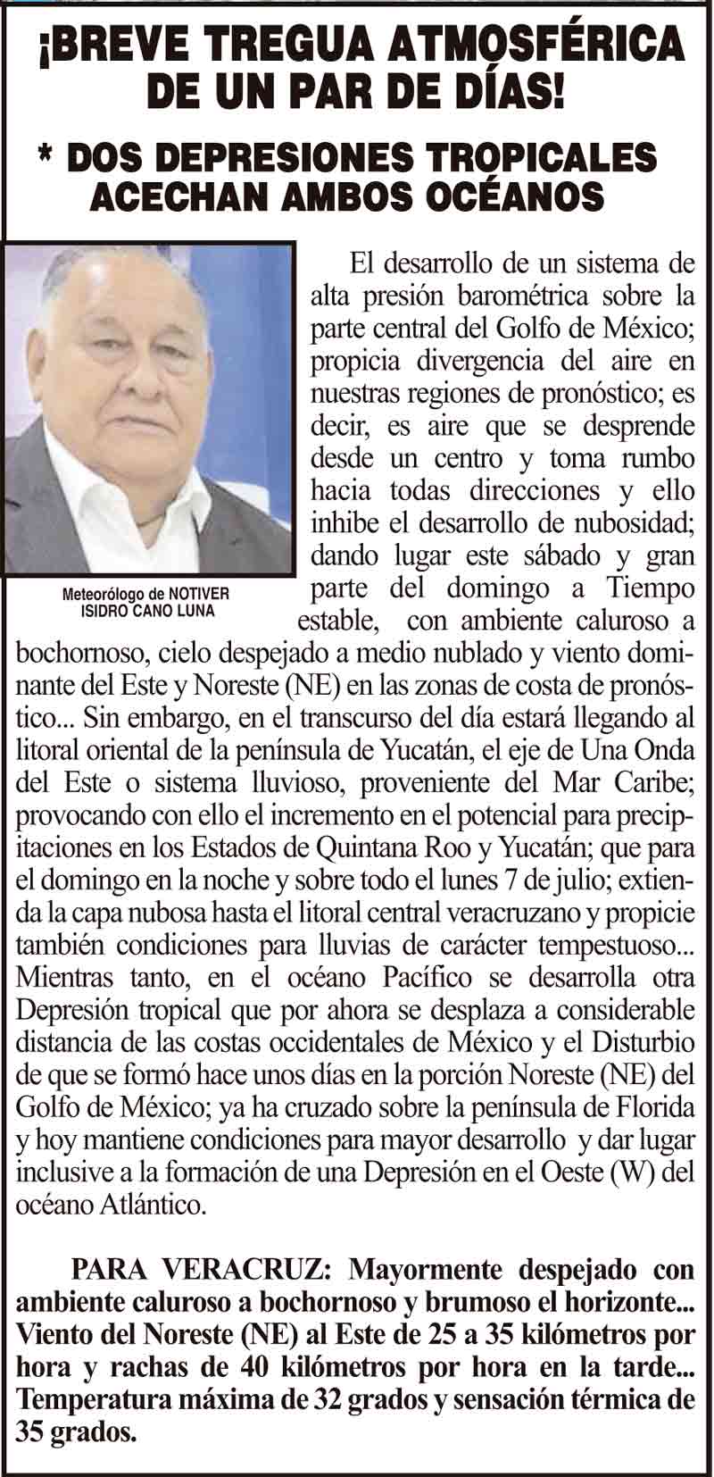 PRIMERA ¡BREVE TREGUA ATMOSFÉRICA DE UN PAR DE DÍAS! - *DOS DEPRESIONES TROPICALES ACECHAN AMBOS OCÉANOS 5 julio 2025 Más Noticias ¡TERROR EN PALMA REAL! - EXPLOSIÓN E INCENDIO... ¡MUERE RAMÓN CANO BELTRÁN! - HAY CONSTERNACIÓN ¡SE LA REVIRA MORENA! - AGARRENSE ¡AGREDEN A REPORTEROS! - EN COATEPEC ¡CONDENAN A EX FUNCIONARIO DE DUARTE! - POR DESAPARICIÓN FORZADA ¡HASTA 70 ASALTOS! - Y DIARIOS... ¡COLECTIVOS VAN CON LA FISCALA! - *Ahora sí acuerdan reforzar búsqueda de desaparecidos, pero señalan falta de presupuesto, personal y avances en las investigaciones ¡SE FUE EL ÚLTIMO MURALISTA! - MELCHOR PEREDO LA ENCUESTA | - DICE QUE HA SER OTRO DERRAME! ¡YA HAY FECHA DEL SALSAFEST! - *Del 12, 13 y 14 de junio en el Salsódromo de Boca