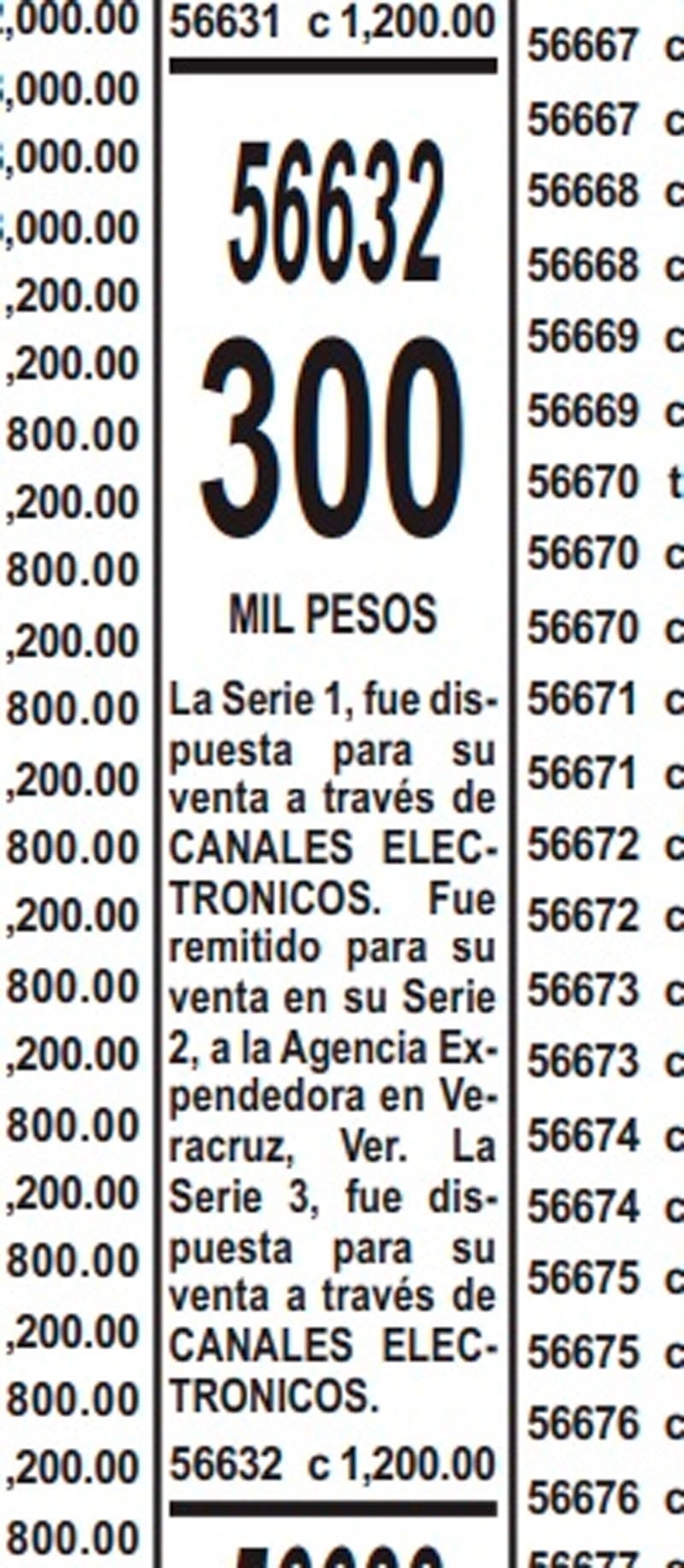 La serie 1 fue dispuesta para su venta a través de canales electrónicos, dice a la letra, fue remitida para su venta en una serie 2 en su serie 2 en la agencia expendedora en Veracruz, Ver. La serie 3 fue dispuesta para su venta a través de canales electrónicos, el premio fue de $300,000.