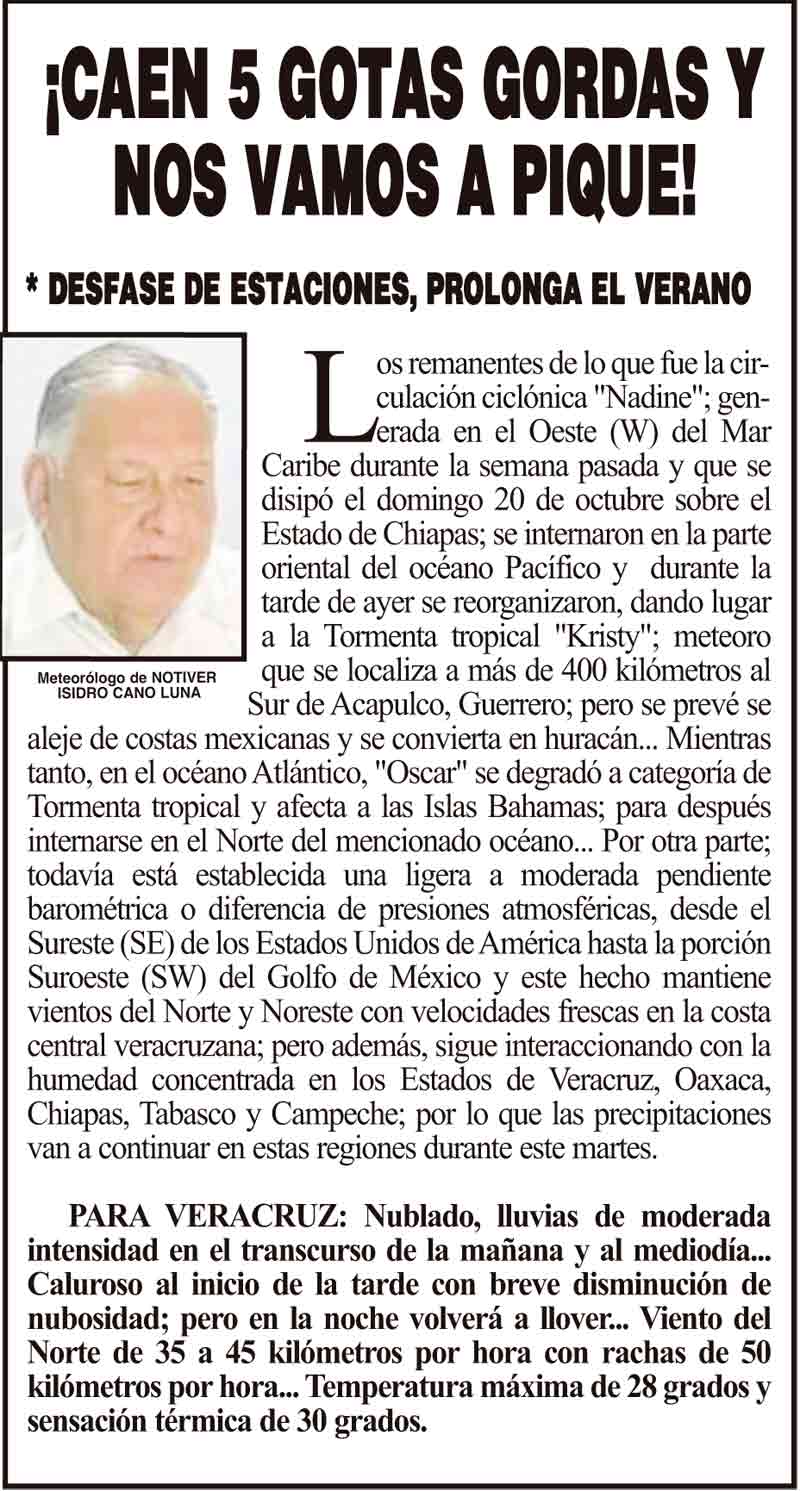 PRIMERA ¡CAEN 5 GOTAS GORDAS Y NOS VAMOS A PIQUE! - *DESFASE DE ESTACIONES, PROLONGA EL VERANO 22 octubre 2024 Más Noticias ¡YA HAY TERNA! - RAÚL PEIMBERT EN LA LISTA ¡“CEMENTERIO”! - DE ULÚAS ¡INAUGURA PATY OTRA CALLE! ¡NO LE CREYERON! - Y LO BUSCAN NOTI-MEME | - ECOS DEL INFORME! ¡VERÓNICA VA CON NAHLE! - Y AL CONGRESO ¡“FAST TRACK”! - *Mientras el Mariner salía y entraba de Pajaritos en Coatzacoalcos ¡OPERATIVO LUPE-REYES! ¡MANDAN LA BILLETIZA! - *Corea manda 150 mil dólares ¡CRISTINA GANA LA ELECCIÓN!