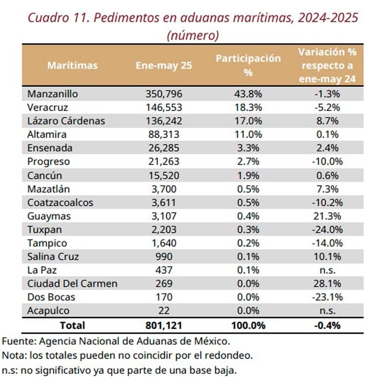En operaciones en Aduanas Marítimas de los meses de enero a mayo de 2025, Veracruz mantuvo su segundo lugar por debajo de Manzanillo, sin embargo presentó una variación de menos 13.2% en variación con respecto a enero a mayo del 2024.