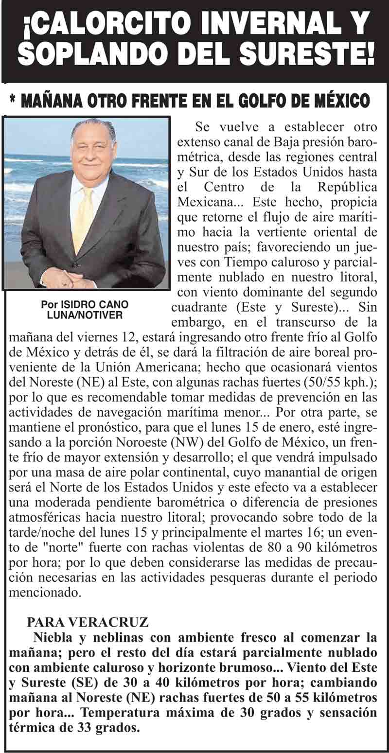 PRIMERA ¡CALORCITO INVERNAL Y SOPLANDO DEL SURESTE! * MAÑANA OTRO FRENTE EN EL GOLFO DE MÉXICO 11 enero 2024 Más Noticias ¡TRIPLE FEMINICIDIO! - TERROR EN TLAPACOYAN ¡A SACAR SUÉTERES! - *Alertan por el Frente Frío 18 ¡HABEMUS CORTE! - CARNAVAL 2026 ¡CLAUSURAN GRANJAS AVÍCOLAS! - *En Lerdo por falta de permisos 2025 ¡ATAQUE ARMADO A TRÁILER! - *No era de los Junior's Klan LOS CARTONES ¡CONMEMORARÁN EL ANIVERSARIO 112 DEL NATALICIO DEL “PIRATA” FUENTE! ¡PEGARÁ NORTAZO! - *Traerá rachas de 85 a 110 kph ¡SERÁ SALMA EMBAJADORA! - DEL MUNDIAL FIFA NOTI-MEME | - YA TIENES TU STARFUCKS?