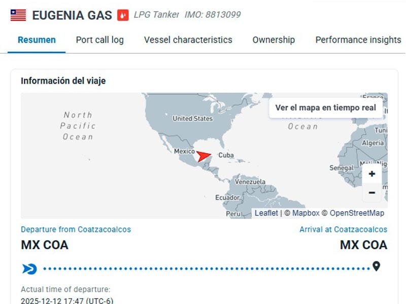 El buque denominado Eugenia Gas con bandera de Liberia que se encontraba en espera de entrar al Puerto en Coatzacoalcos procedente de Moa en Cuba, finalmente atracó en la terminal de Pemex "Pajaritos", para cargar 3 mil toneladas de amoniaco con destino a la isla.