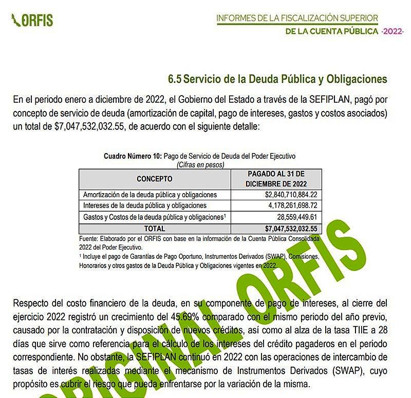 El Órgano de Fiscalización Superior (ORFIS), informó que en el periodo enero a diciembre de 2022, el Gobierno del Estado a través de la SEFIPLAN, pagó por concepto de servicio de deuda (amortización de capital, pago de intereses, gastos y costos asociados) un total de 7 mil 047 millones 532 mil 032.55 pesos.
