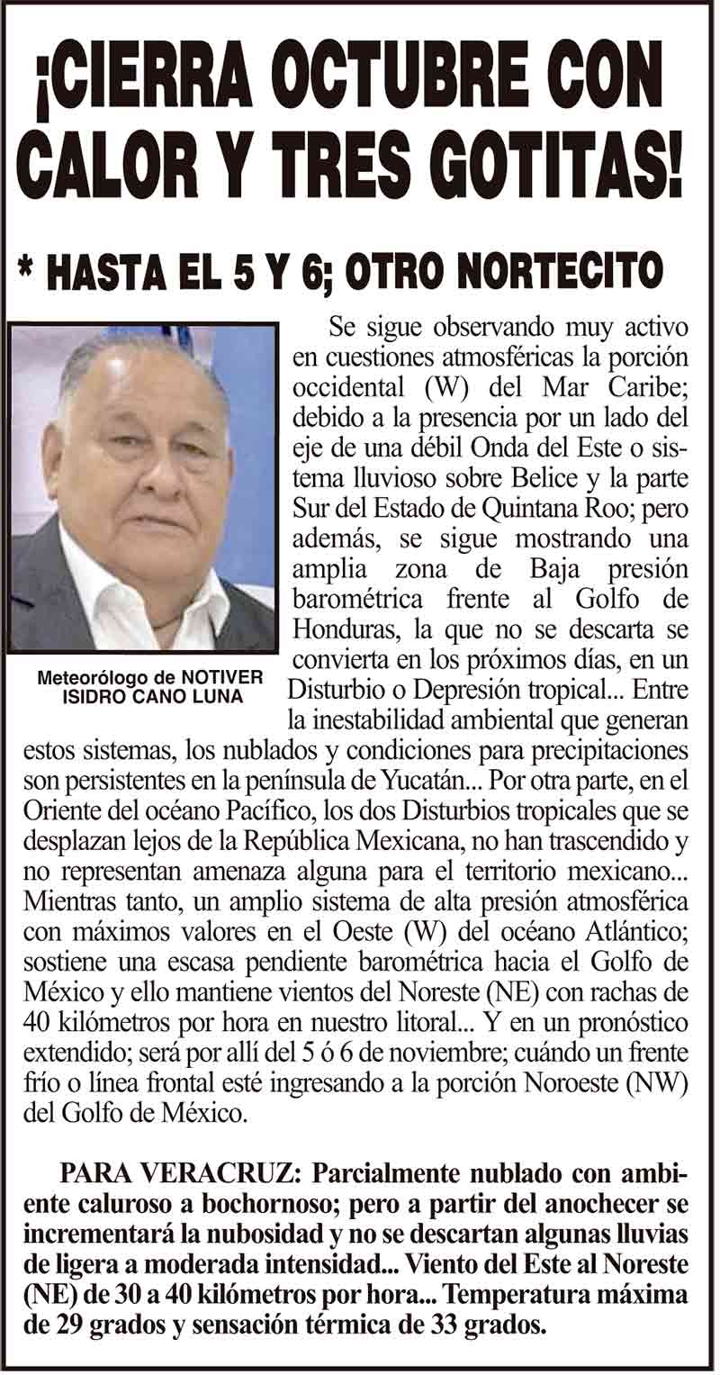 PRIMERA ¡CIERRA OCTUBRE CON CALOR Y TRES GOTITAS! - *HASTA EL 5 Y 6; OTRO NORTECITO 31 octubre 2024 Más Noticias ¡YA HAY TERNA! - RAÚL PEIMBERT EN LA LISTA ¡“CEMENTERIO”! - DE ULÚAS ¡INAUGURA PATY OTRA CALLE! ¡NO LE CREYERON! - Y LO BUSCAN NOTI-MEME | - ECOS DEL INFORME! ¡VERÓNICA VA CON NAHLE! - Y AL CONGRESO ¡“FAST TRACK”! - *Mientras el Mariner salía y entraba de Pajaritos en Coatzacoalcos ¡OPERATIVO LUPE-REYES! ¡MANDAN LA BILLETIZA! - *Corea manda 150 mil dólares ¡CRISTINA GANA LA ELECCIÓN!