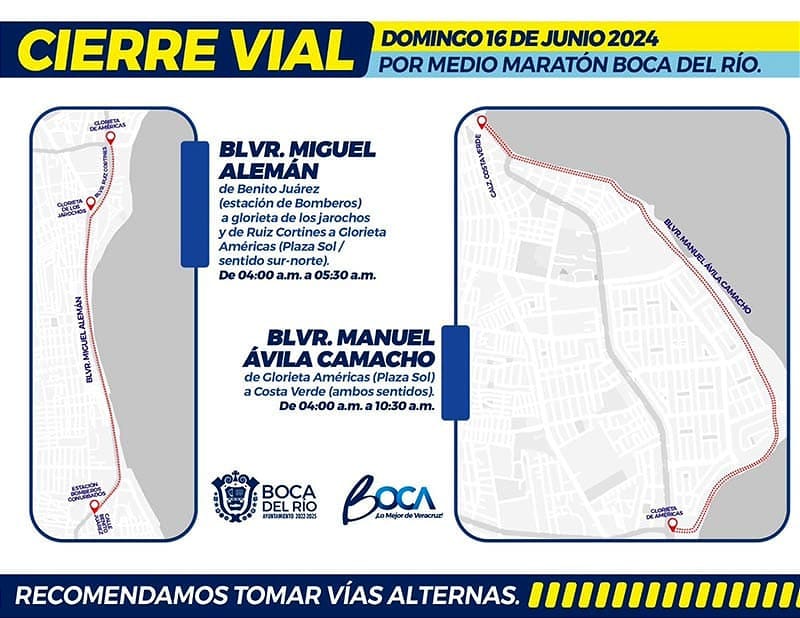 También de las 4 a las 5:30 horas estará cerrado el bulevar "Miguel Alemán" desde el cruce con Benito Juárez en la cabecera municipal de Boca hasta la Glorieta de Los Voladores.