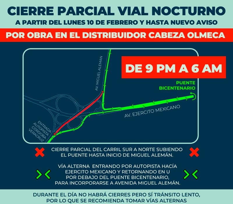 El horario de cierre será de las 9:00 p.m. a 6:00 a.m. habrá cierre parcial del carril sur a norte, desde la subida del distribuidor Cabeza Olmeca hasta el inicio de la avenida Miguel Alemán.