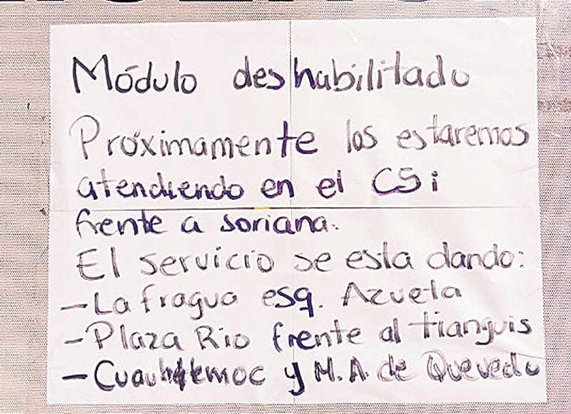 En el mismo cartel se indica que los módulos en operación son los de Plaza Río frente al tianguis de Boca, el famoso de La Fragua ubicado en la esquina con Azueta y el de Cuauhtémoc y Miguel Ángel de Quevedo, frente a la gasolinera "Kavi".