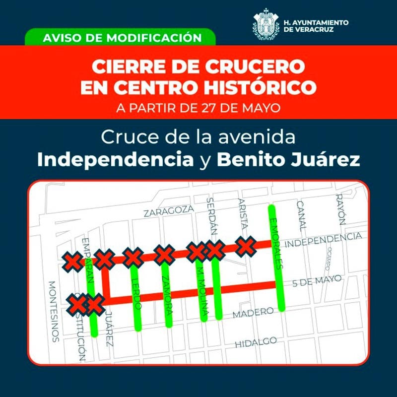 (AVC) El H. Ayuntamiento de Veracruz informa a la ciudadanía que, a partir del martes 27 de mayo, será cerrado temporalmente el cruce de la avenida Independencia con la calle Benito Juárez, en el Centro Histórico de la ciudad.
