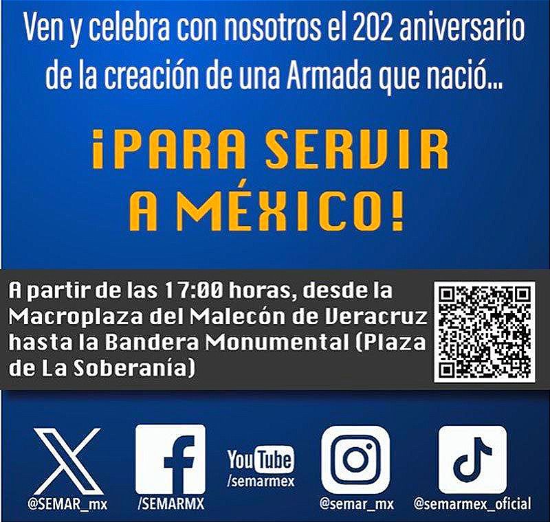 17:00 horas: Inicio de la ceremonia oficial alusiva a los “202 Aniversario de la Creación de la Armada de México”, en la Macroplaza del malecón del puerto de Veracruz y posteriormente el desfile militar, además de otros ejercicios y el espectáculo piromusical que estará a cargo de personal de esta Institución.