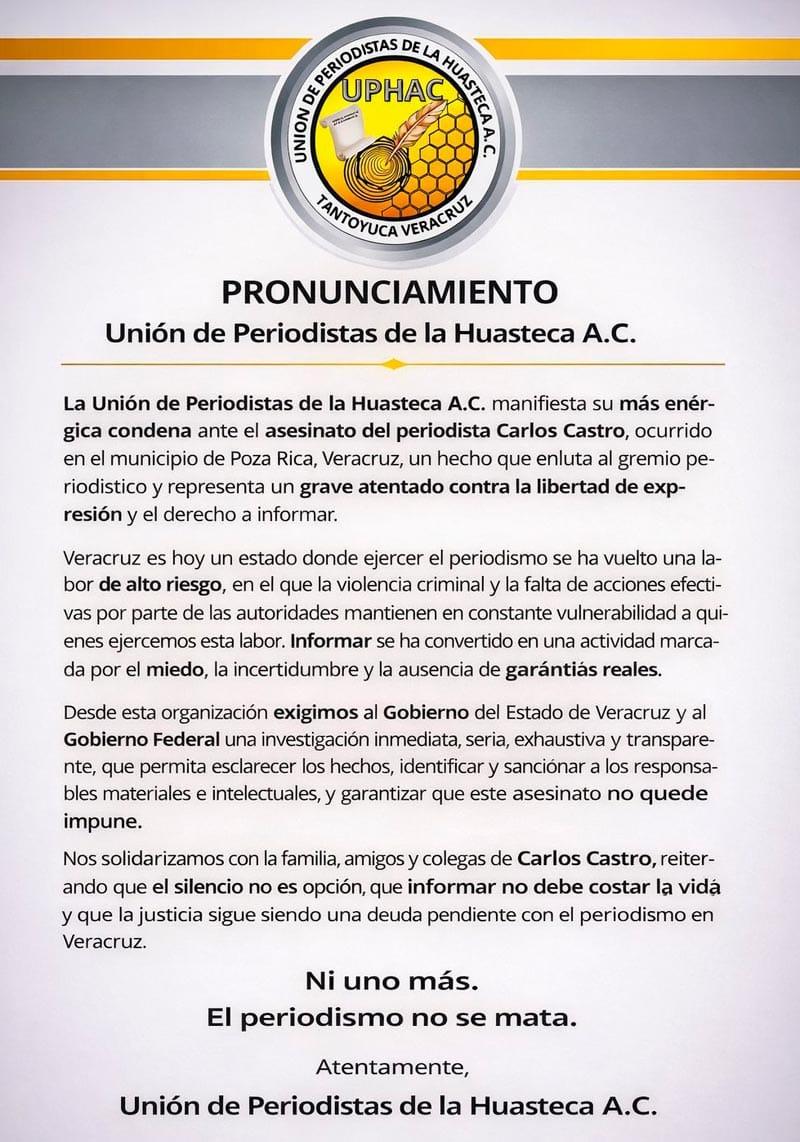 La Unión de Periodistas de la Huasteca A.C. condenó de manera enérgica el asesinato del reportero Carlos Castro, especialista en nota roja, ocurrido ayer cerca de las 19:00 hora en una birrería de la ciudad de Poza Rica, al norte del estado de Veracruz.