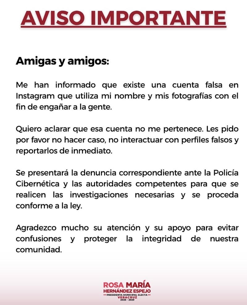 La alcaldesa electa de Veracruz, Rosa María Hernández Espejo, dio a conocer que han creado ahora una cuenta falsa a su nombre en Instagram.