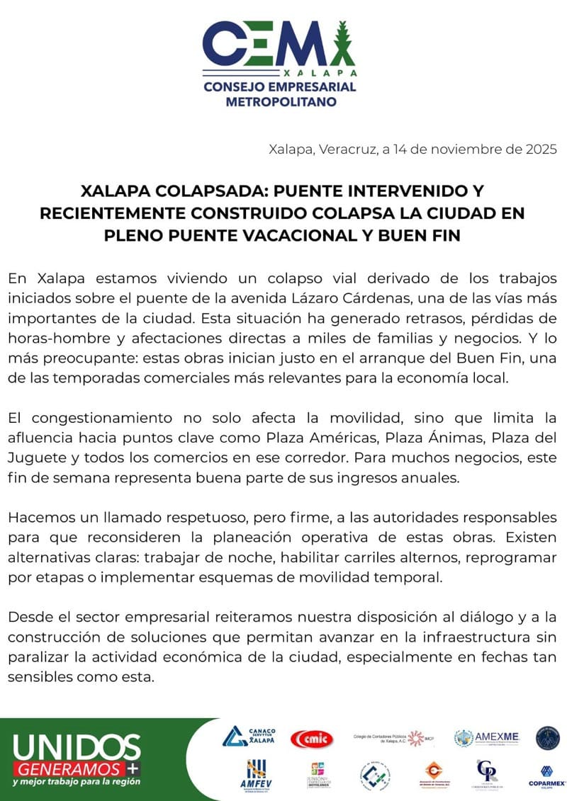 El CEMX, que agrupa a diversas cámaras y asociaciones (como CANACO Xalapa, CMIC, AMFEV, etc.), hizo un llamado "respetuoso, pero firme" a las autoridades responsables para que reconsideren la planeación operativa de estas obras.