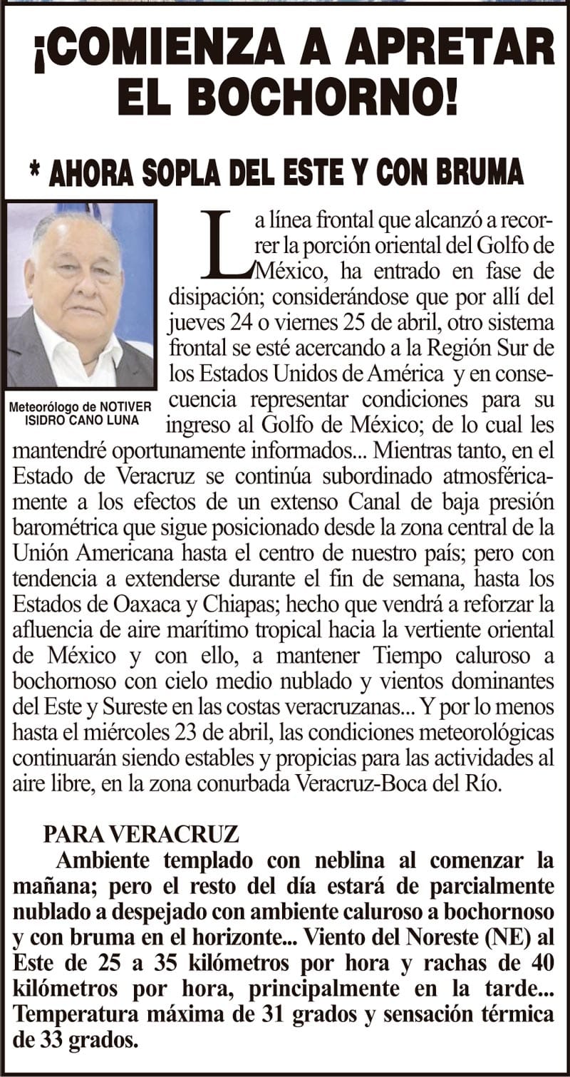 PRIMERA ¡COMIENZA A APRETAR EL BOCHORNO! - *AHORA SOPLA DEL ESTE Y CON BRUMA 17 abril 2025 Más Noticias ¡BLOQUEO DEL SECTOR SALUD EN PLAN DE RÍO! ¡TRAGEDIA EN LA AUTOPISTA VERACRUZ–XALAPA! NOTI-MEME | - YA LLEGÓ LA RAMA! LA ENCUESTA | - YA VIENE! ¡RECONOCIMIENTO A DIRIGENTE DE TAXISTAS! ¡LE VAN A ENTRAR! - *Claudia ordena a Nahle ¡QUIEREN MANDOS DE LA MARINA! - EN LAS POLICÍAS MUNICIPALES ¡ATACA EL VIRUS COXSACKIE, HAY 71 CASOS! - *Con mayor incidencia en 2025 y casos concentrados en Xalapa y Veracruz LOS CARTONES ¡SALMA SACA VIDEO! - RETEMUNDIAL...