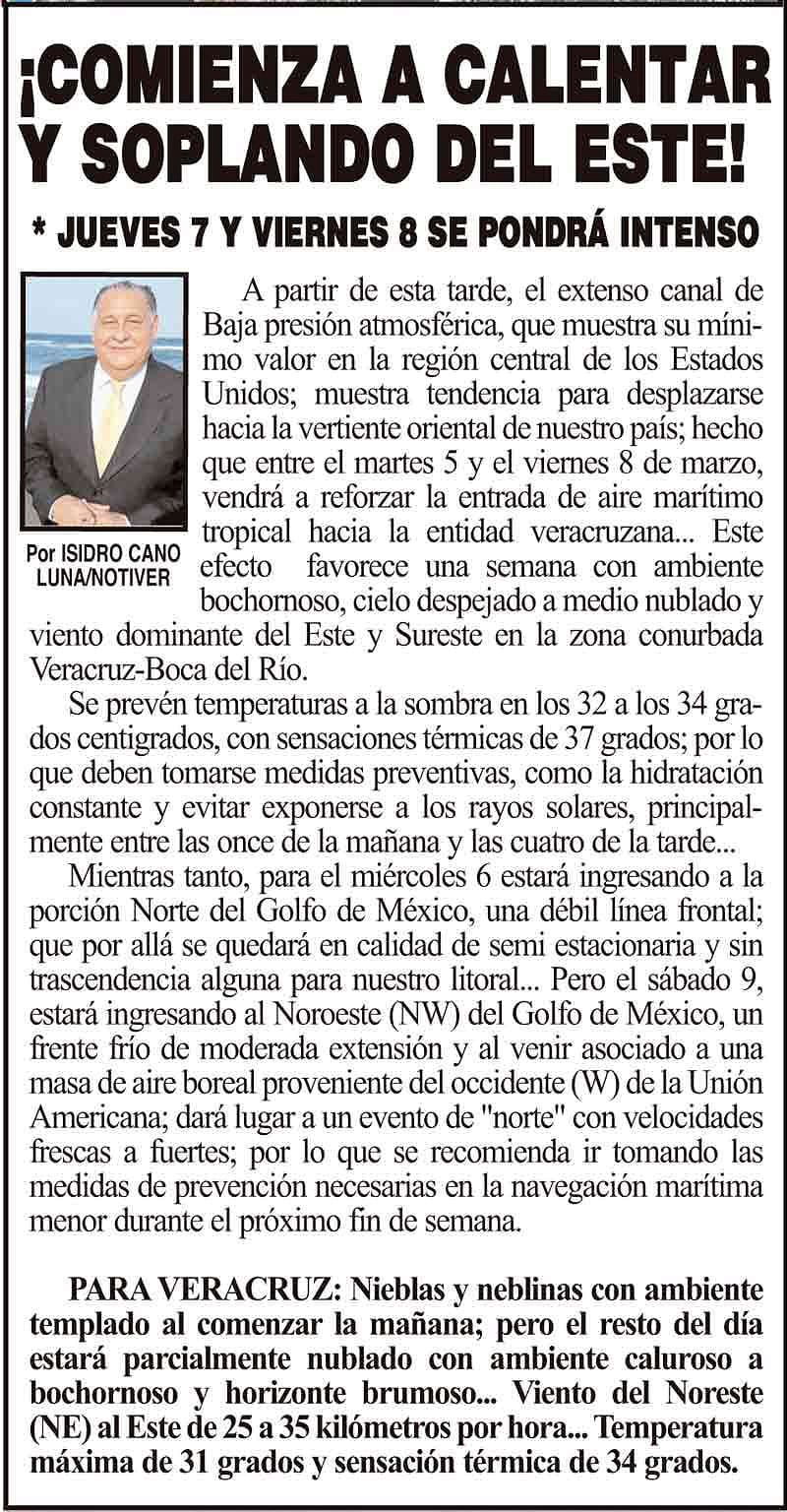 PRIMERA ¡COMIENZA A CALENTAR Y SOPLANDO DEL ESTE! * JUEVES 7 Y VIERNES 8 SE PONDRÁ INTENSO 4 marzo 2024 Más Noticias ¡YA HAY TERNA! - RAÚL PEIMBERT EN LA LISTA ¡“CEMENTERIO”! - DE ULÚAS ¡INAUGURA PATY OTRA CALLE! ¡NO LE CREYERON! - Y LO BUSCAN NOTI-MEME | - ECOS DEL INFORME! ¡VERÓNICA VA CON NAHLE! - Y AL CONGRESO ¡“FAST TRACK”! - *Mientras el Mariner salía y entraba de Pajaritos en Coatzacoalcos ¡OPERATIVO LUPE-REYES! ¡MANDAN LA BILLETIZA! - *Corea manda 150 mil dólares ¡CRISTINA GANA LA ELECCIÓN!