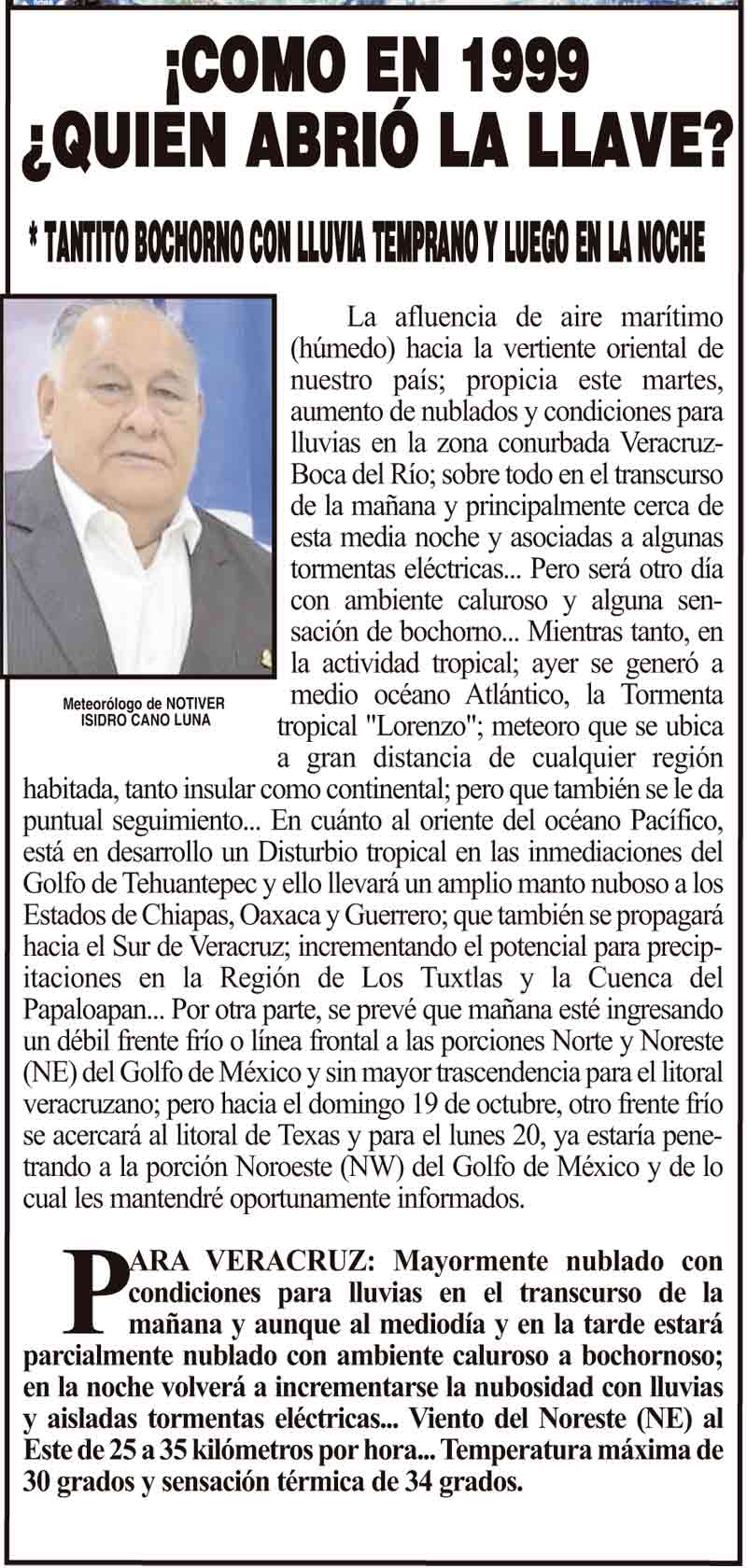 PRIMERA ¡COMO EN 1999 ¿QUIEN ABRIÓ LA LLAVE? - *TANTITO BOCHORNO CON LLUVIA TEMPRANO Y LUEGO EN LA NOCHE 14 octubre 2025 Más Noticias ¡BUSCAN SÚPER AGENTES! - EN BOCA ¡LE METEN LA DOLARIZA! - *A la modernización de Hutchinson LA ENCUESTA | - PONDRÁN LONAS DEL BIENESTAR! ¡AUMENTAN JAULAZOS EN GEO LOS PINOS! LOS CARTONES ¡MIL MILLONES DE DÓLARES! - PA’CONSTELLATION ¡MATAN A LAS ABEJAS! - CON FERTILIZANTES ¡LO RE-UTILIZARÁN! - EL CHAPOPOTE DE LAS PLAYAS ¡FUERON 9 AHOGADOS! - TRAS OPERATIVO SEMANA SANTA ESTATAL ¡EXIGEN QUE LE PAGUEN! - *Denuncia a aseguradora ya que solo quieren darle seis mil pesos