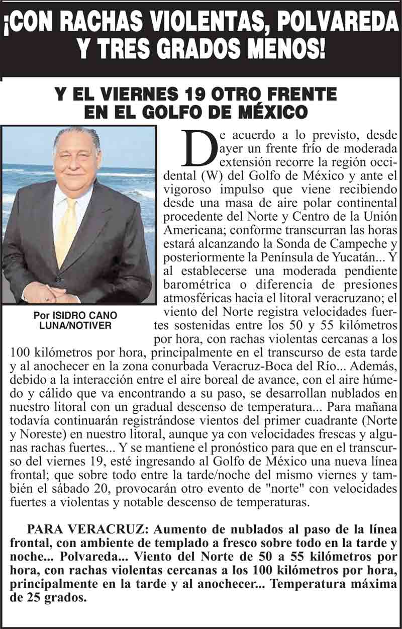 PRIMERA ¡CON RACHAS VIOLENTAS, POLVAREDA Y TRES GRADOS MENOS! *Y EL VIERNES 19 OTRO FRENTE EN EL GOLFO DE MÉXICO 16 enero 2024 Más Noticias LA PORTADA - SÁBADO 6 DE DICIEMBRE 2025 ¡SE ESTÁ FORMANDO UN INTENSO "NORTE" PARA EL LUNES 8! - *UN FIN DE SEMANA CON CALOR, BRUMA Y DEL ESTE ¡YA HAY TERNA! - RAÚL PEIMBERT EN LA LISTA ¡“CEMENTERIO”! - DE ULÚAS ¡INAUGURA PATY OTRA CALLE! ¡NO LE CREYERON! - Y LO BUSCAN NOTI-MEME | - ECOS DEL INFORME! ¡VERÓNICA VA CON NAHLE! - Y AL CONGRESO ¡“FAST TRACK”! - *Mientras el Mariner salía y entraba de Pajaritos en Coatzacoalcos ¡OPERATIVO LUPE-REYES!