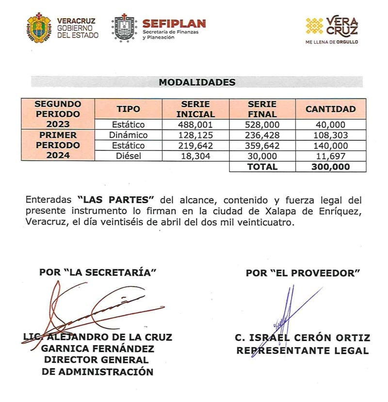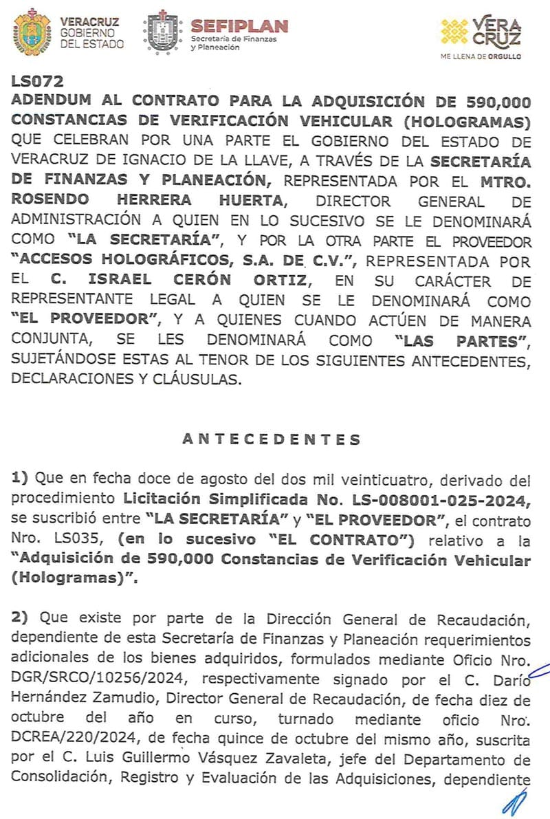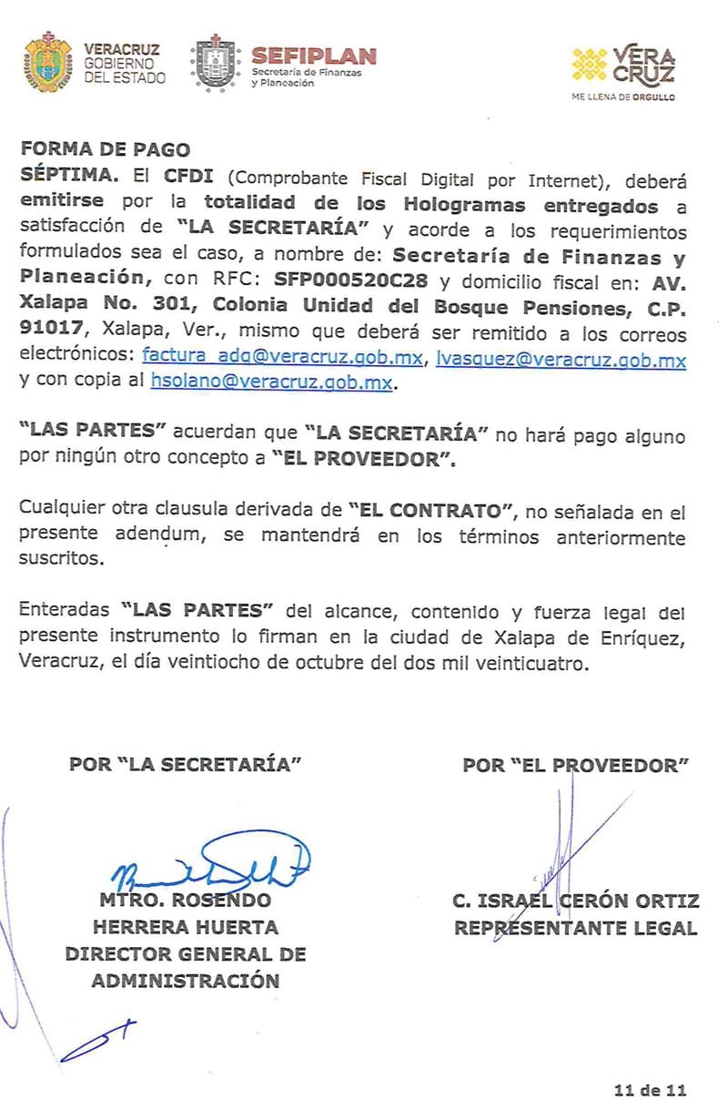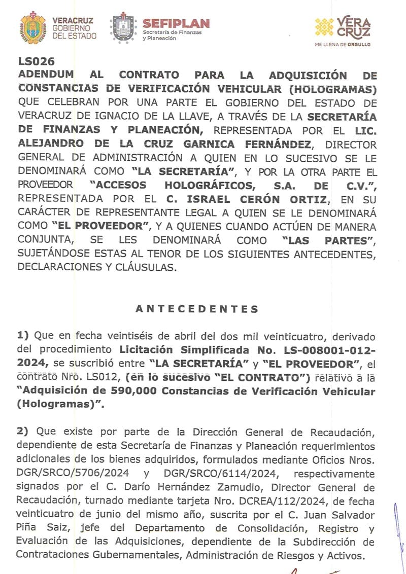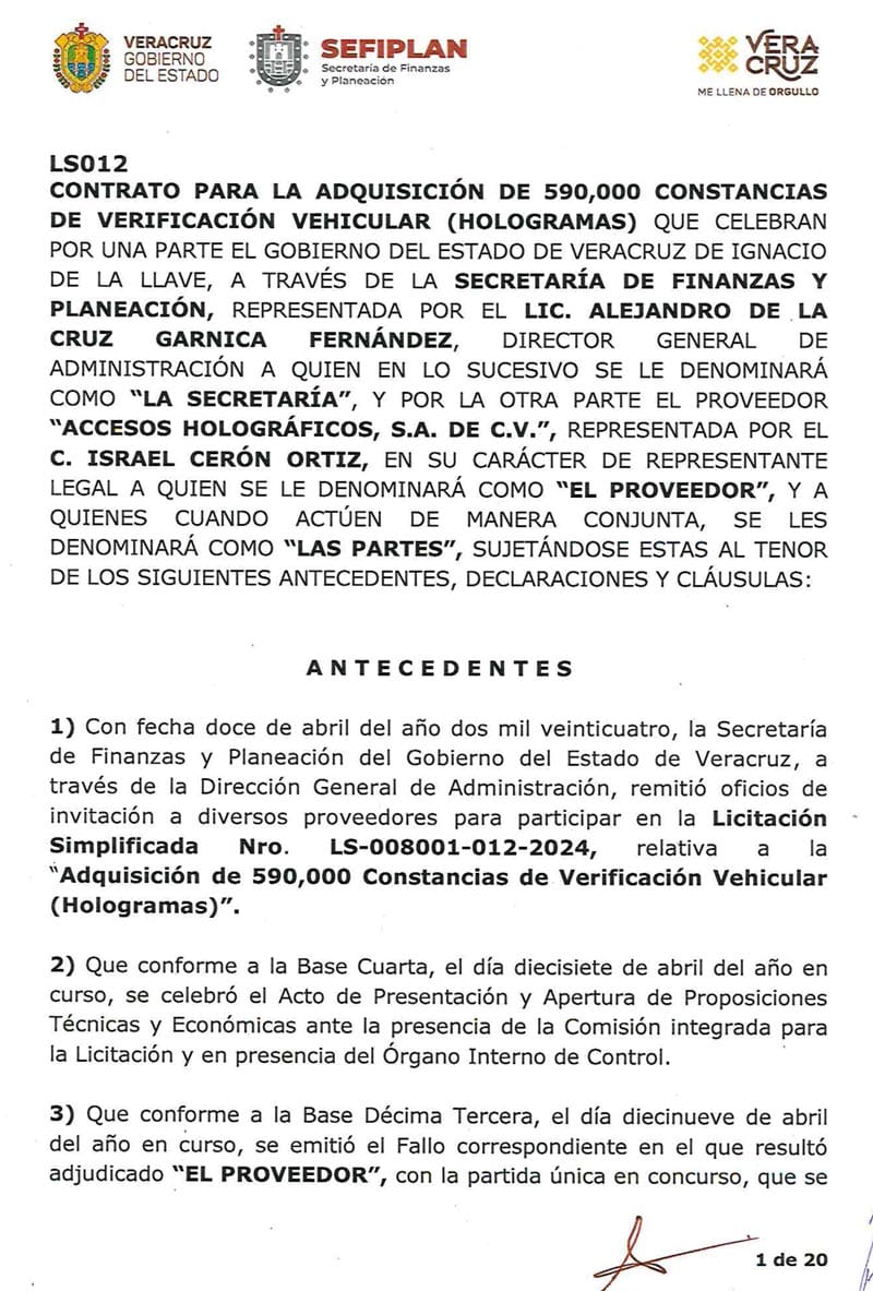 En el 2023, el Gobierno de Veracruz hizo una licitación simplificada con la que le entregó un contrato para compra de hasta 1 millón 480 mil hologramas cuyo costo unitario fue de 16.50 pesos más IVA.