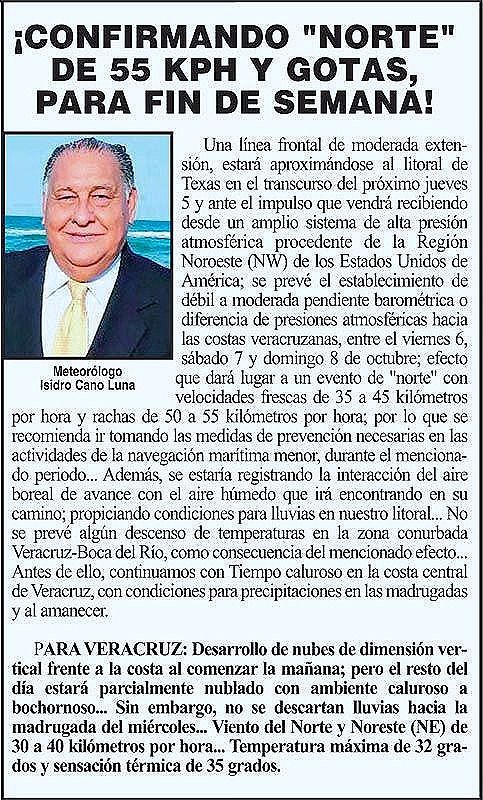 PRIMERA ¡CONFIRMANDO "NORTE" DE 55 KPH Y GOTAS, PARA FIN DE SEMANA! *Y GOTAS, PARA FIN DE SEMANA 3 octubre 2023 Más Noticias ¡YA HAY TERNA! - RAÚL PEIMBERT EN LA LISTA ¡“CEMENTERIO”! - DE ULÚAS ¡INAUGURA PATY OTRA CALLE! ¡NO LE CREYERON! - Y LO BUSCAN NOTI-MEME | - ECOS DEL INFORME! ¡VERÓNICA VA CON NAHLE! - Y AL CONGRESO ¡“FAST TRACK”! - *Mientras el Mariner salía y entraba de Pajaritos en Coatzacoalcos ¡OPERATIVO LUPE-REYES! ¡MANDAN LA BILLETIZA! - *Corea manda 150 mil dólares ¡CRISTINA GANA LA ELECCIÓN!