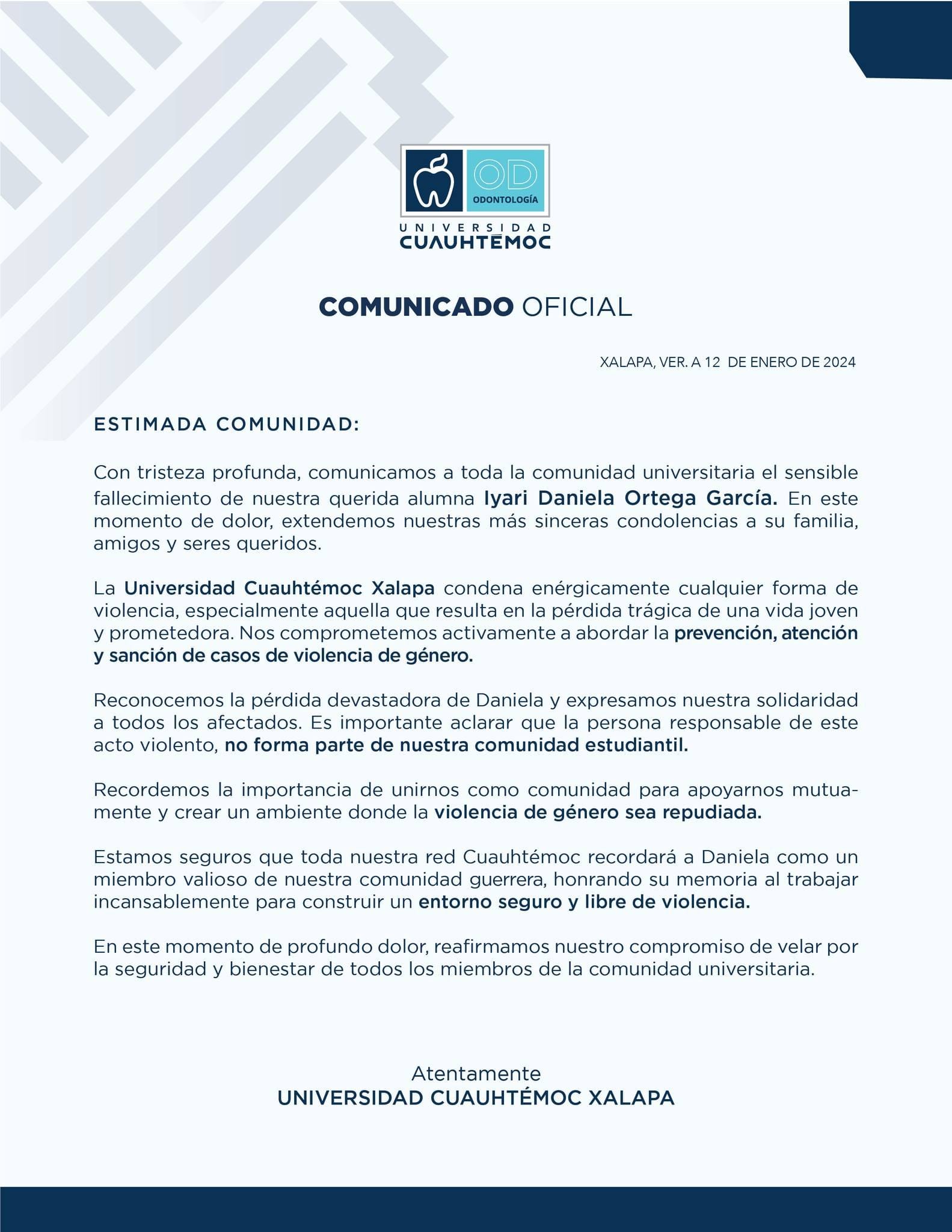 "La Universidad Cuauhtémoc Xalapa condena enérgicamente cualquier forma de violencia, especialmente aquella que resulta en la pérdida trágica de una vida joven y prometedora. Reconocemos la pérdida devastadora de Daniela y expresamos nuestra solidaridad a todos los afectados. Es importante aclarar que la persona responsable de este acto violento, no forma parte de nuestra comunidad estudiantil..."