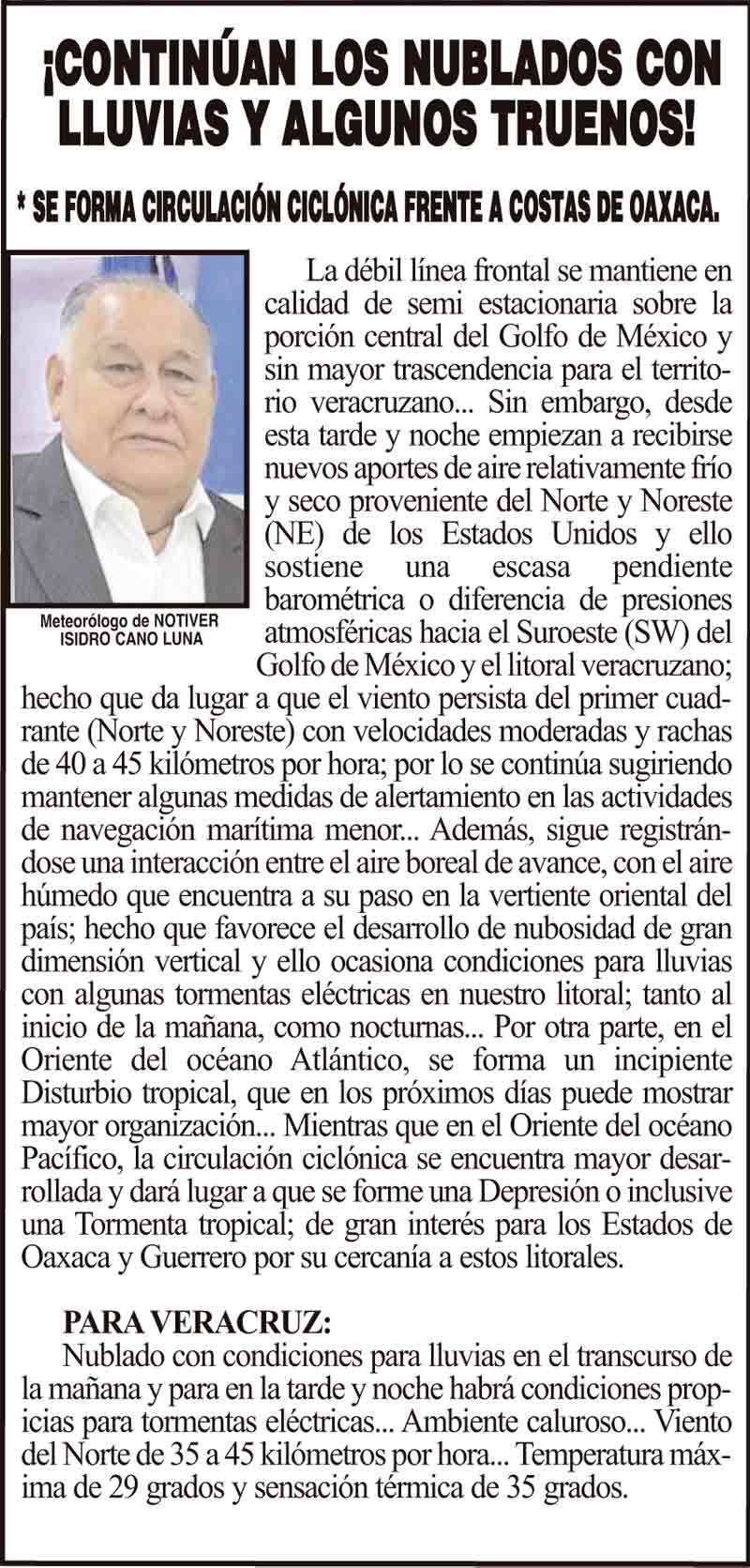 PRIMERA ¡CONTINÚAN LOS NUBLADOS CON LLUVIAS Y ALGUNOS TRUENOS! - *SE FORMA CIRCULACIÓN CICLÓNICA FRENTE A COSTAS DE OAXACA. 11 septiembre 2025 Más Noticias LA PORTADA - VIERNES 5 DE DICIEMBRE 2025 ¡HOY SOPLA FRESCO Y DE FRENTE! - *PERO EL LUNES 8, ESTARÁ FUERTE Y CON LLUVIAS. LA ENCUESTA | - ME ESTÁS OYENDO INÚTIL?... ¡CON BAILONGOS QUIEREN AYUDAR A LOS DAMNIFICADOS DEL NORTE! - *El mismo Alor, toca los timbales ¡YA SE LA APROBARON! - REFORMA PARA LA FISCALÍA ESTATAL NOTI-MEME | - ASÍ ESTUVO EL INFORME... ¡MÁS DE 9 MIL MILLONES! - *Eso costaría cancelar en Veracruz al Grupo MAS ¡LE DAN LUZ VERDE! - DESDE GUATEMALA ¡EL CUARTO! ¡Y COM-PA-RE-CIÓ! - ÁNDALE...
