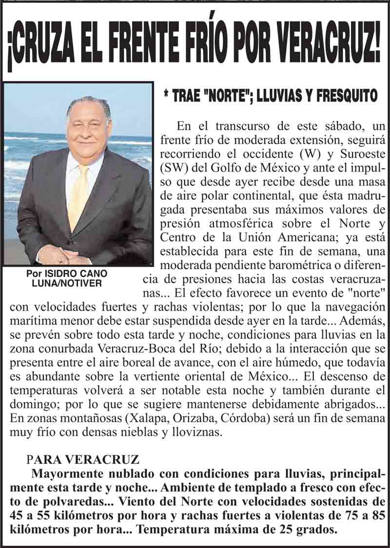 PRIMERA ¡CRUZA EL FRENTE FRÍO POR VERACRUZ! * TRAE "NORTE"; LLUVIAS Y FRESQUITO 20 enero 2024 Más Noticias LA PORTADA - VIERNES 24 DE ABRIL 2026 ¡LLEGAN CHINOS A VER EL TRANVÍA! ¡PRIMER LUGAR EN HOMICIDIOS DOLOSOS! - TENIA QUE SER ¡MARYJOSE TENDRÁ SU HOSPITAL! ¡LOS DEJARON SOLOS! - A FAMILIARES DE LA DOCTORA ASESINADA ¡SE LO MOCHAN A EX ALCALDE! - DE COATZA ¡RECONOCEN A CONCHITA DÍAZ CHÁZARO! - *Es la Cronista de la Ciudad NOTI-MEME | - QUÉ LIBRO VAS A REGALAR! ¡SIGUE LA RACHA! ¡CONSTERNACIÓN! - *Muere el profesor Roque Velázquez Rivera