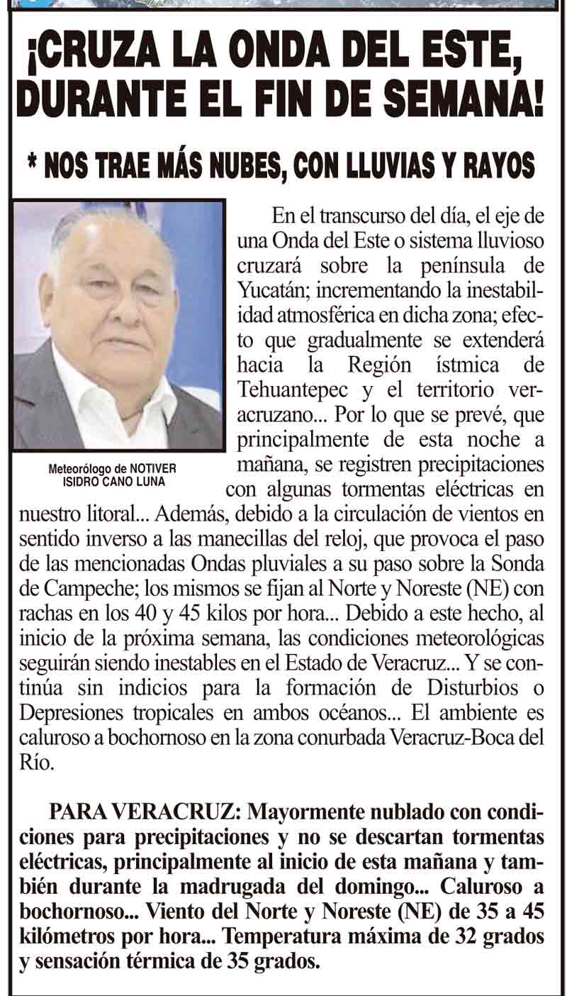 PRIMERA ¡CRUZA LA ONDA DEL ESTE, DURANTE EL FIN DE SEMANA! - *NOS TRAE MÁS NUBES, CON LLUVIAS Y RAYOS 12 julio 2025 Más Noticias ¡ASESINAN A EX CANDIDATO A LA ALCALDÍA DE MISANTLA! - *Era del Movimiento Ciudadano ¡HOMENAJE PÓSTUMO AL “PAPO”! ¡SE VA EL FOFO! - DEL PRI LA ENCUESTA | - FELICIDADES! ¡SE DESCARRILA EL TREN! - PA’SUSTO ¡YA NO COBRARÁN PARQUÍMETROS! ¡SE VAN POR LAS NUBES LOS PAVOS! ¡DETECTAR DISFAGIA A TIEMPO PREVIENE LAS COMPLICACIONES DE SALUD: IMSS VERACRUZ NORTE! ¡CUATRO MUNICIPIOS SUBIRÁN EL PREDIAL! - YA SE SUPO ¡CUMBRE DE TRANSPORTE MULTIMODAL!