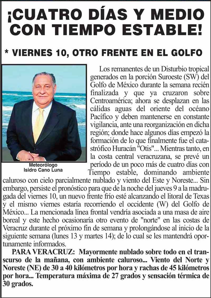 PRIMERA ¡CUATRO DÍAS Y MEDIO CON TIEMPO ESTABLE! * VIERNES 10, OTRO FRENTE EN EL GOLFO 6 noviembre 2023 Más Noticias ¡TRIPLE FEMINICIDIO! - TERROR EN TLAPACOYAN ¡A SACAR SUÉTERES! - *Alertan por el Frente Frío 18 ¡HABEMUS CORTE! - CARNAVAL 2026 ¡CLAUSURAN GRANJAS AVÍCOLAS! - *En Lerdo por falta de permisos 2025 ¡ATAQUE ARMADO A TRÁILER! - *No era de los Junior's Klan LOS CARTONES ¡CONMEMORARÁN EL ANIVERSARIO 112 DEL NATALICIO DEL “PIRATA” FUENTE! ¡PEGARÁ NORTAZO! - *Traerá rachas de 85 a 110 kph ¡SERÁ SALMA EMBAJADORA! - DEL MUNDIAL FIFA NOTI-MEME | - YA TIENES TU STARFUCKS?