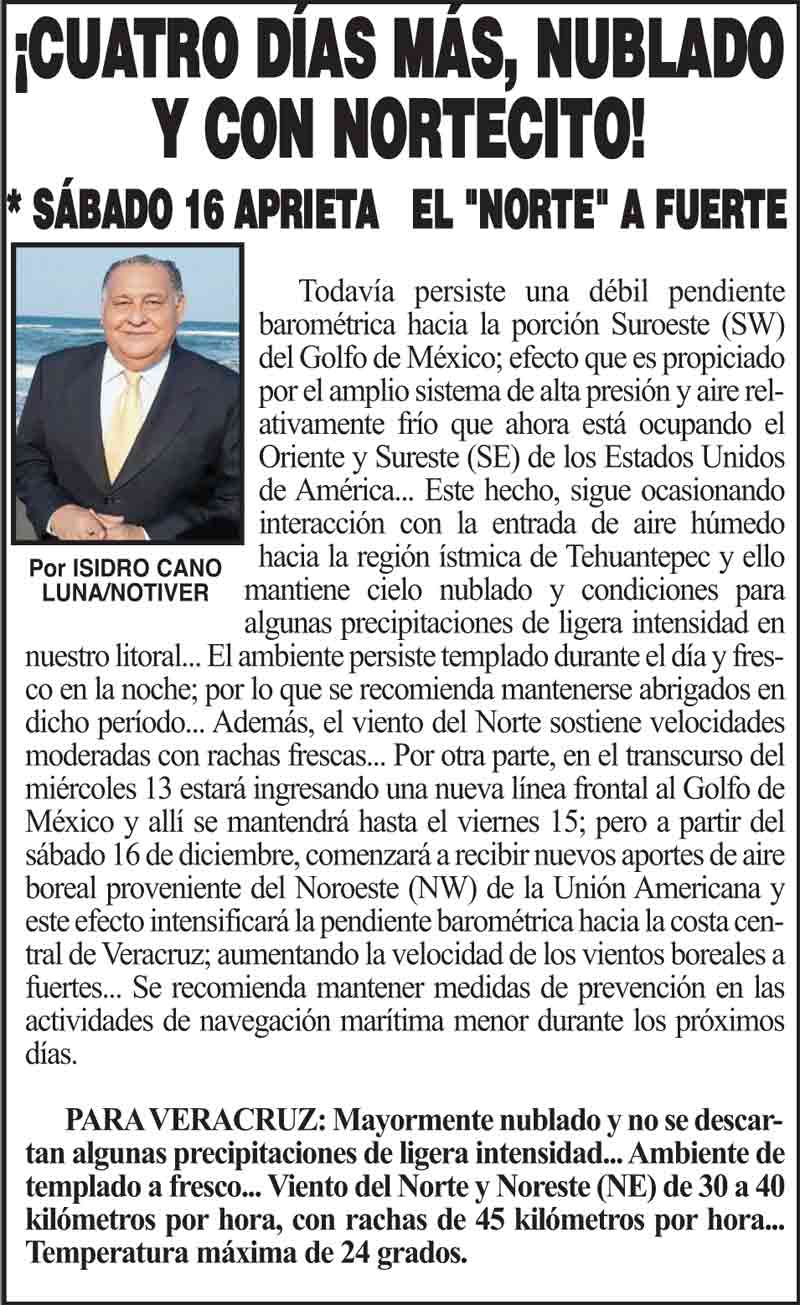 PRIMERA ¡CUATRO DÍAS MÁS, NUBLADO Y CON NORTECITO! *SÁBADO 16 APRIETA EL "NORTE" A FUERTE 12 diciembre 2023 Más Noticias ¡YA HAY TERNA! - RAÚL PEIMBERT EN LA LISTA ¡“CEMENTERIO”! - DE ULÚAS ¡INAUGURA PATY OTRA CALLE! ¡NO LE CREYERON! - Y LO BUSCAN NOTI-MEME | - ECOS DEL INFORME! ¡VERÓNICA VA CON NAHLE! - Y AL CONGRESO ¡“FAST TRACK”! - *Mientras el Mariner salía y entraba de Pajaritos en Coatzacoalcos ¡OPERATIVO LUPE-REYES! ¡MANDAN LA BILLETIZA! - *Corea manda 150 mil dólares ¡CRISTINA GANA LA ELECCIÓN!