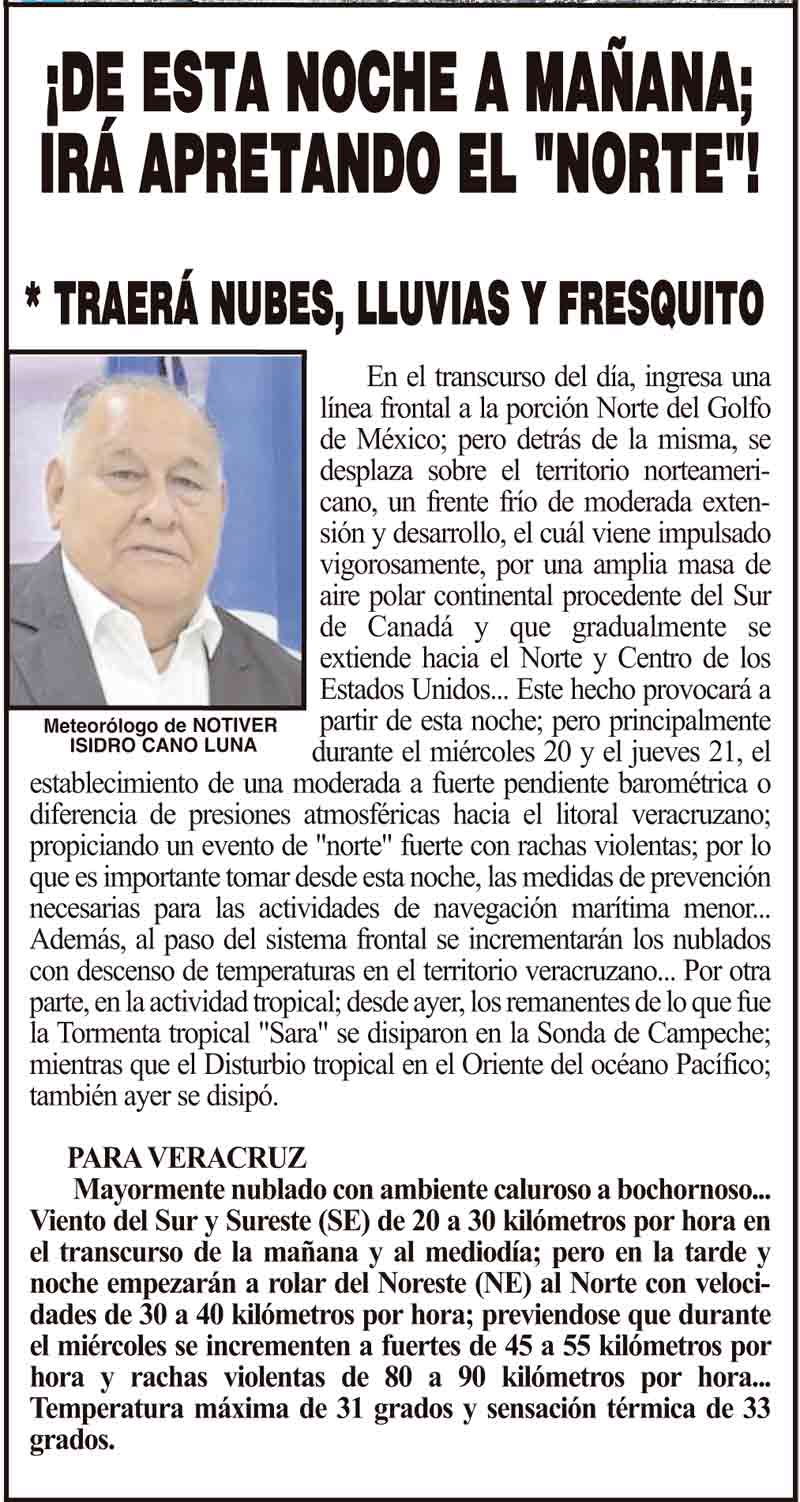 PRIMERA ¡DE ESTA NOCHE A MAÑANA; IRÁ APRETANDO EL "NORTE"! - *TRAERÁ NUBES, LLUVIAS Y FRESQUITO 19 noviembre 2024 Más Noticias ¡COMIENZA “PONTE OREJA”! - *100 boqueños beneficiados con estudios de audiometría ¡NI UNA BOMBA MÁS! - POR AHORA... ¡CAMBIOS EN LA CANACAR! ¡PELÍCANOS MUERTOS! - ALERTAN CONTAMINACIÓN ¡VA LA UV! - AL OBSERVATORIO ¡CARAMBOLA TRÁGICA! - EN LAS CUMBRES ¡PARAN LOS QUETZALLI! - *Operadores realizaron paro parcial por jornadas de casi 20 horas y bajos pagos ¡SE VAN A ASTURIAS! ¡MANIOBRISTAS VS. PULIDO! - YA SE ARMÓ ¡CHAPOPOTAZO! - PA’SUMECHA