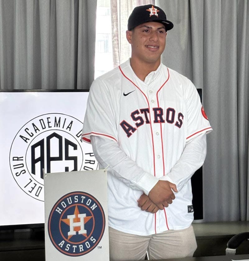 La firma se concretó en una conferencia de prensa con la presencia de directivos de la academia de béisbol Prospectos del Sur, donde se formó el jugador y un supervisor de los Astros.