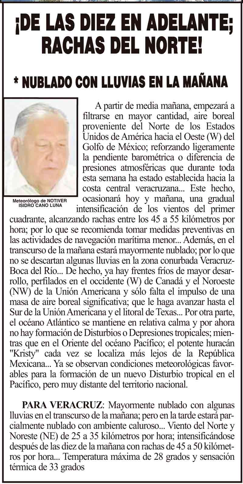 PRIMERA ¡DE LAS DIEZ EN ADELANTE; RACHAS DEL NORTE! - *NUBLADO CON LLUVIAS EN LA MAÑANA 26 octubre 2024 Más Noticias ¡YA HAY TERNA! - RAÚL PEIMBERT EN LA LISTA ¡“CEMENTERIO”! - DE ULÚAS ¡INAUGURA PATY OTRA CALLE! ¡NO LE CREYERON! - Y LO BUSCAN NOTI-MEME | - ECOS DEL INFORME! ¡VERÓNICA VA CON NAHLE! - Y AL CONGRESO ¡“FAST TRACK”! - *Mientras el Mariner salía y entraba de Pajaritos en Coatzacoalcos ¡OPERATIVO LUPE-REYES! ¡MANDAN LA BILLETIZA! - *Corea manda 150 mil dólares ¡CRISTINA GANA LA ELECCIÓN!