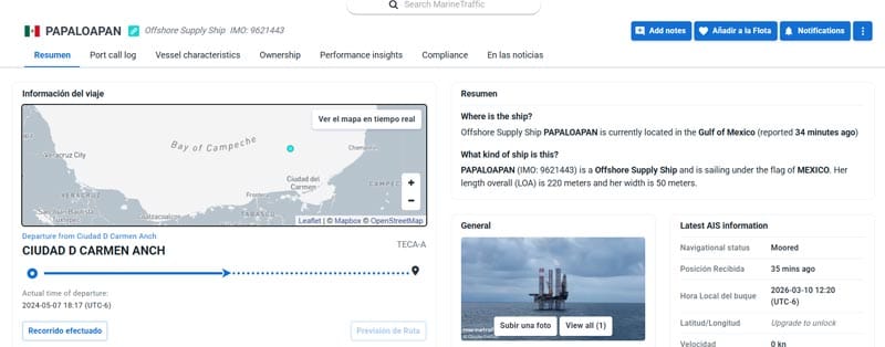 Sin embargo, los desplazamientos del Papaloapan en marzo confirman una actividad constante entre Veracruz y Campeche, marcada por entradas breves al puerto jarocho y salidas inmediatas hacia el sur del Golfo de México.