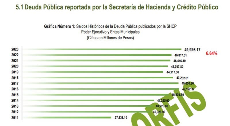“En las cifras reportadas por la SHCP se observa un aumento del 6.64% en relación con la Deuda Pública y Obligaciones registrada al 31 de diciembre de 2022. Sin embargo y de acuerdo con los importes identificados en las revisiones y auditorías practicadas por el ORFIS, se determinó un importe de 52,451.46 MDP al cierre del ejercicio 2023, por lo que existe una diferencia de 2,525.29 MDP en los saldos reportados por la Secretaría al mismo año, los cuales se originaron principalmente por la falta de registro y actualización”.
