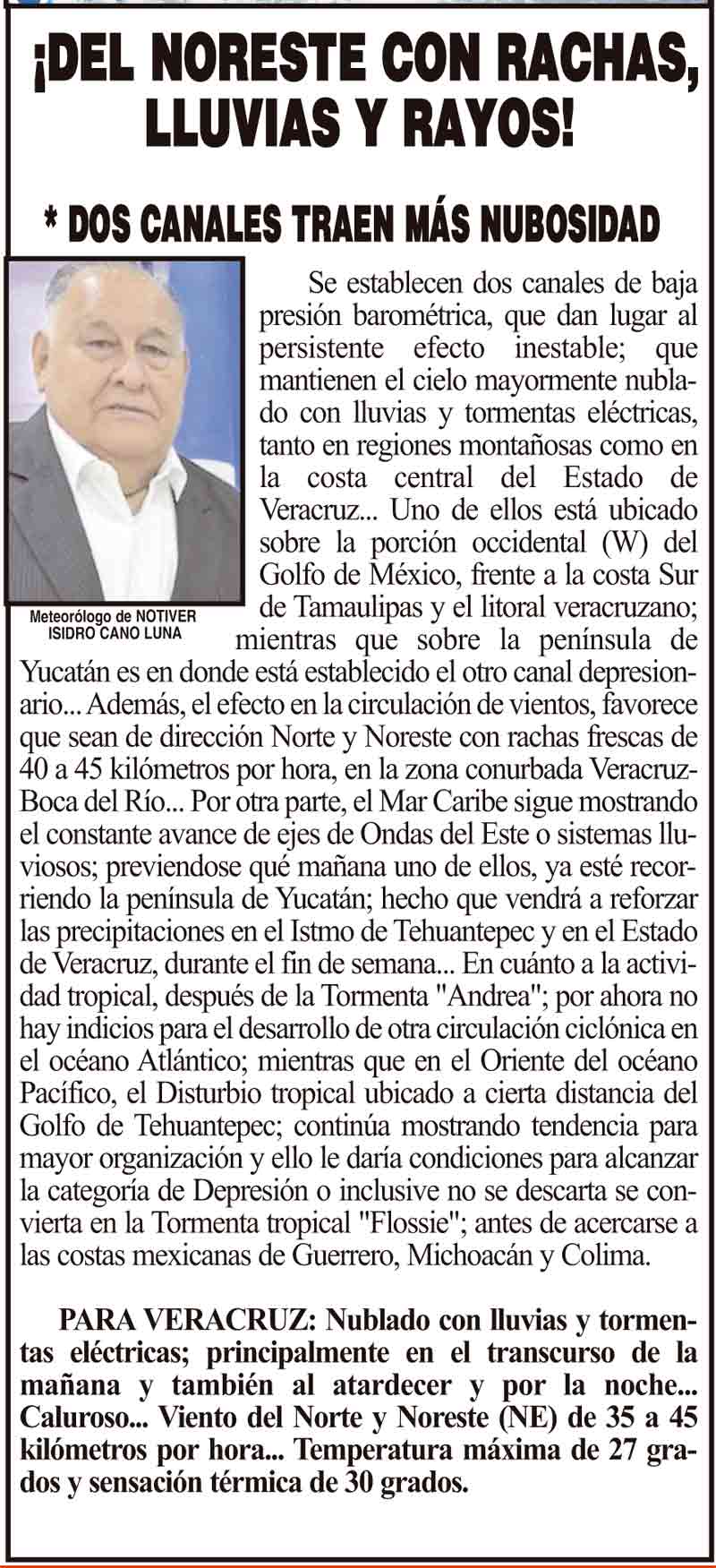 PRIMERA ¡DEL NORESTE CON RACHAS, LLUVIAS Y RAYOS! - *DOS CANALES TRAEN MÁS NUBOSIDAD 26 junio 2025 Más Noticias LA PORTADA - VIERNES 5 DE DICIEMBRE 2025 ¡HOY SOPLA FRESCO Y DE FRENTE! - *PERO EL LUNES 8, ESTARÁ FUERTE Y CON LLUVIAS. LA ENCUESTA | - ME ESTÁS OYENDO INÚTIL?... ¡CON BAILONGOS QUIEREN AYUDAR A LOS DAMNIFICADOS DEL NORTE! - *El mismo Alor, toca los timbales ¡YA SE LA APROBARON! - REFORMA PARA LA FISCALÍA ESTATAL NOTI-MEME | - ASÍ ESTUVO EL INFORME... ¡MÁS DE 9 MIL MILLONES! - *Eso costaría cancelar en Veracruz al Grupo MAS ¡LE DAN LUZ VERDE! - DESDE GUATEMALA ¡EL CUARTO! ¡Y COM-PA-RE-CIÓ! - ÁNDALE...