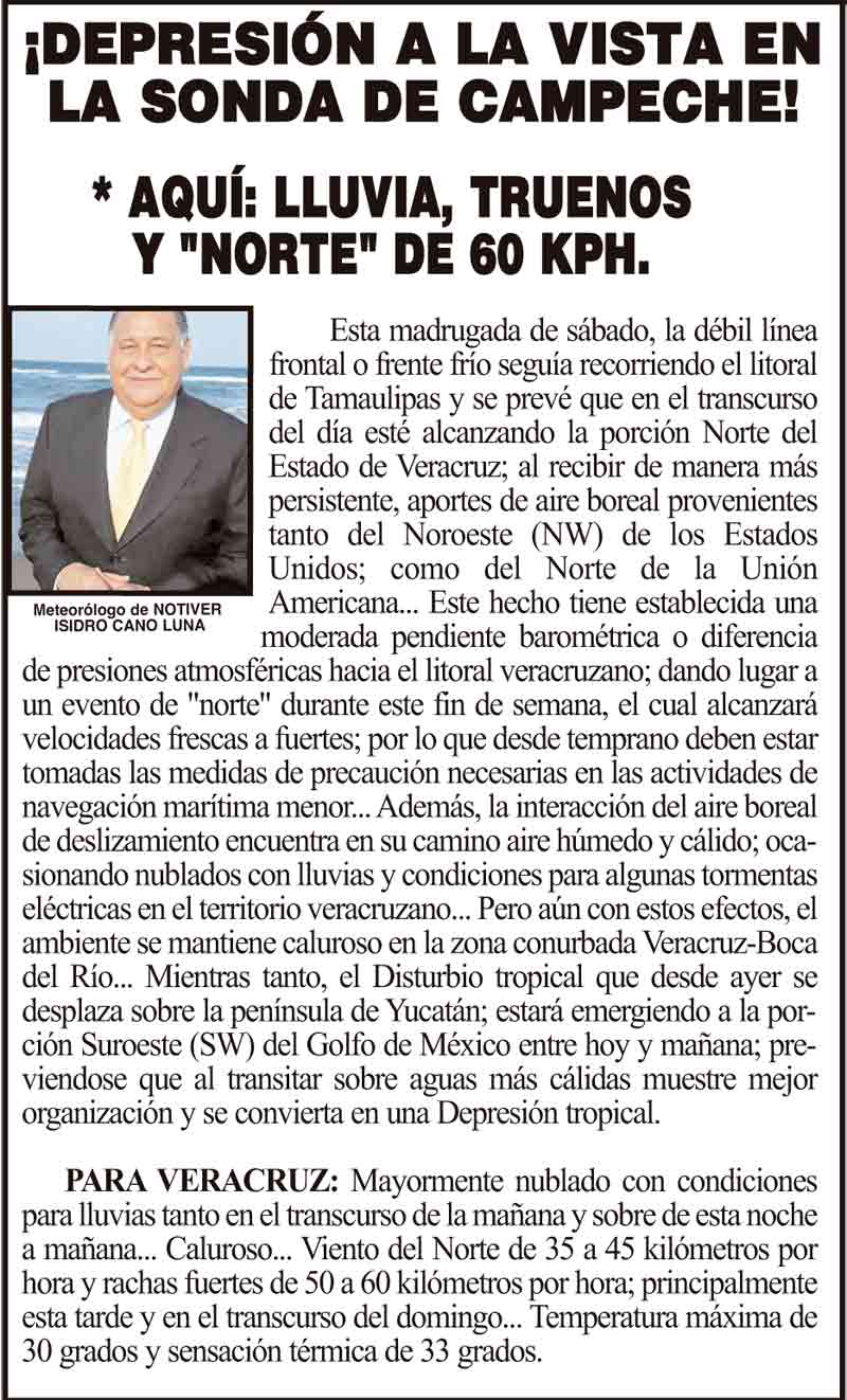 PRIMERA ¡DEPRESIÓN A LA VISTA EN LA SONDA DE CAMPECHE! - *AQUÍ: LLUVIA, TRUENOS Y "NORTE" DE 60 KPH... 7 septiembre 2024 Más Noticias ¡YA HAY TERNA! - RAÚL PEIMBERT EN LA LISTA ¡“CEMENTERIO”! - DE ULÚAS ¡INAUGURA PATY OTRA CALLE! ¡NO LE CREYERON! - Y LO BUSCAN NOTI-MEME | - ECOS DEL INFORME! ¡VERÓNICA VA CON NAHLE! - Y AL CONGRESO ¡“FAST TRACK”! - *Mientras el Mariner salía y entraba de Pajaritos en Coatzacoalcos ¡OPERATIVO LUPE-REYES! ¡MANDAN LA BILLETIZA! - *Corea manda 150 mil dólares ¡CRISTINA GANA LA ELECCIÓN!