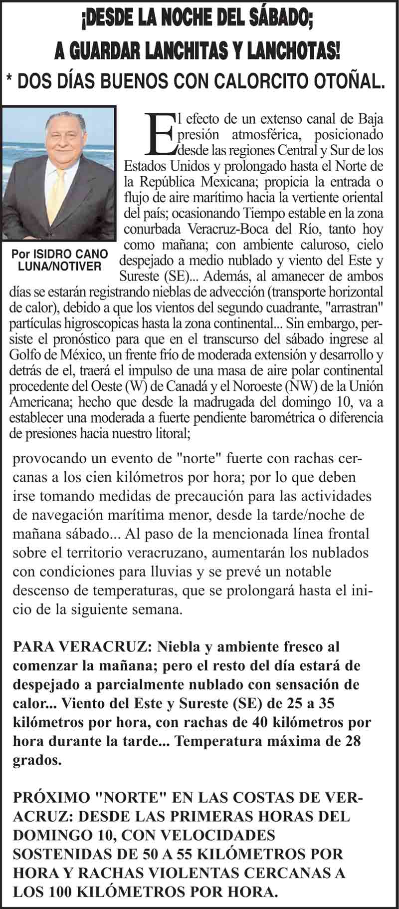 PRIMERA ¡DESDE LA NOCHE DEL SÁBADO; A GUARDAR LANCHITAS Y LANCHOTAS! * DOS DÍAS BUENOS CON CALORCITO OTOÑAL. 8 diciembre 2023 Más Noticias LA PORTADA - DOMINGO 12 DE ABRIL 2026 ¡DANIELA LLEGA A 100 DÍAS! LOS CARTONES ¡“PIRATAS DEL ASFALTO” - NO PARAN ASALTOS LA ENCUESTA | - DICE QUE HA DE SER OTRO DERRAME! ¡SEGUNDO ROUND! - TAN TAN ¡ROYA AFECTA 40 MIL HECTÁREAS DE CULTIVO DE CAFÉ EN VERACRUZ! ¡A GARROTAZOS! - RUDEZA INNECESARIA... ¡A BALAZOS! - SE PASARON... ¡SON DIRIGENTES OBREROS! - LOS BALEADOS DE LA PANCHO VILLA