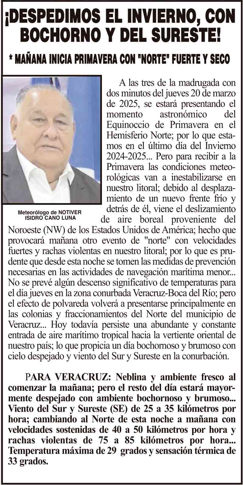 PRIMERA ¡DESPEDIMOS EL INVIERNO, CON BOCHORNO Y DEL SURESTE! - *MAÑANA INICIA PRIMAVERA CON "NORTE" FUERTE Y SECO 19 marzo 2025 Más Noticias ¡BUSCAN SÚPER AGENTES! - EN BOCA ¡LE METEN LA DOLARIZA! - *A la modernización de Hutchinson LA ENCUESTA | - PONDRÁN LONAS DEL BIENESTAR! ¡AUMENTAN JAULAZOS EN GEO LOS PINOS! LOS CARTONES ¡MIL MILLONES DE DÓLARES! - PA’CONSTELLATION ¡MATAN A LAS ABEJAS! - CON FERTILIZANTES ¡LO RE-UTILIZARÁN! - EL CHAPOPOTE DE LAS PLAYAS ¡FUERON 9 AHOGADOS! - TRAS OPERATIVO SEMANA SANTA ESTATAL ¡EXIGEN QUE LE PAGUEN! - *Denuncia a aseguradora ya que solo quieren darle seis mil pesos
