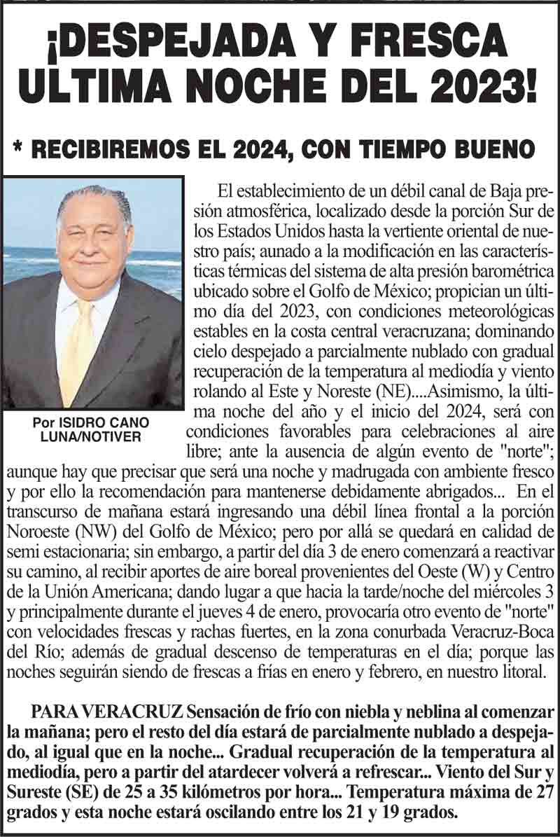 PRIMERA ¡DESPEJADA Y FRESCA ULTIMA NOCHE DEL 2023! * RECIBIREMOS EL 2024, CON TIEMPO BUENO 31 diciembre 2023 Más Noticias ¡LA PREMIAN EN LA UV! - A SÚPER ESTUDIANTE ¡ACATAN SENTENCIA! - CASO ASCENSIO ¡OPERATIVO “SALVAVIDAS”! ¡TAMBIÉN TAMBORES DE GUERRA! - UYUYYYY ¡VIRGILIO TORRES A TRÁNSITO! - *Era el segundo de Andrés Delgado, en la delegación de Medellín ¡EJECUTAN A LÍDER DE TAXISTAS! - EN ACAYUCAN ¡TIENEN MELLO! - AY NANITAS ¡CUMPLE MANDINGA 425 AÑOS! - *Viene un Príncipe de Camerún NOTI-MEME | - ''LOS GRINCHS'' LOS CARTONES