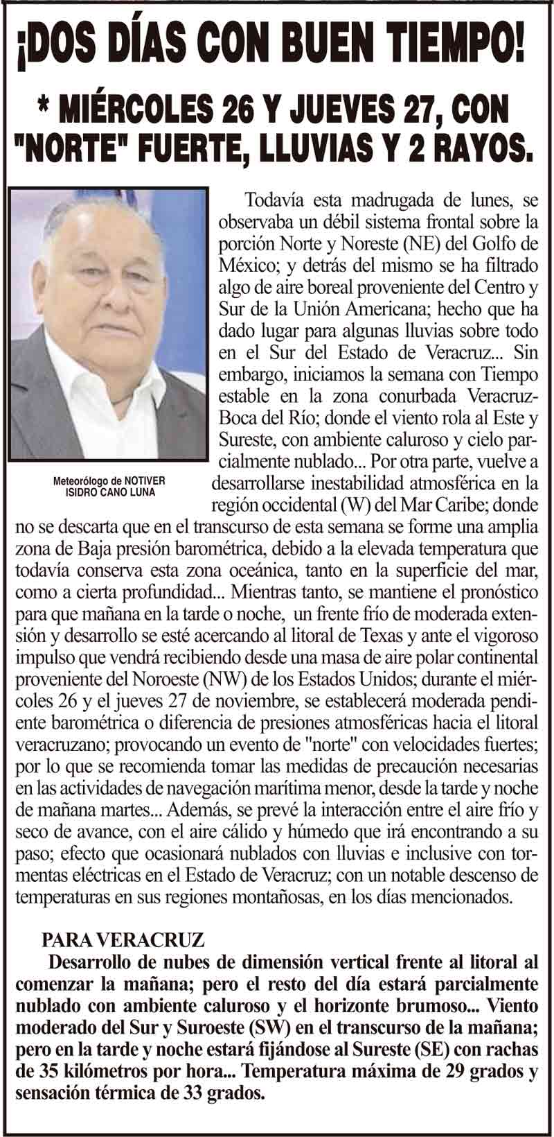 PRIMERA ¡DOS DÍAS CON BUEN TIEMPO! - *MIÉRCOLES 26 Y JUEVES 27, CON "NORTE" FUERTE, LLUVIAS Y 2 RAYOS. 25 noviembre 2025 Más Noticias ¡LOS DEJARON SOLOS! - MORENA VUELVE A REVENTAR SESIÓN ¡VIENEN DESDE COLOMBIA A LA NAVAL! LOS CARTONES ¡NI MEDICAMENTOS NI UNIFORMES! - *En hospital de Boca del Río ¡SE TRAEN CUMBRE AUTOMOTRIZ! ¡REBAMBARAMBA! - MANIOBRISTAS VS. MANIOBRISTAS ¡LO HOMOLOGAN! - *El feminicidio en Veracruz ¡MEGA-CABALGATA! ¡JUSTICIA PARA BERTHA! - MARCHAS POR LA DOCTORA ¡YA HAY PLAN DE DESARROLLO!