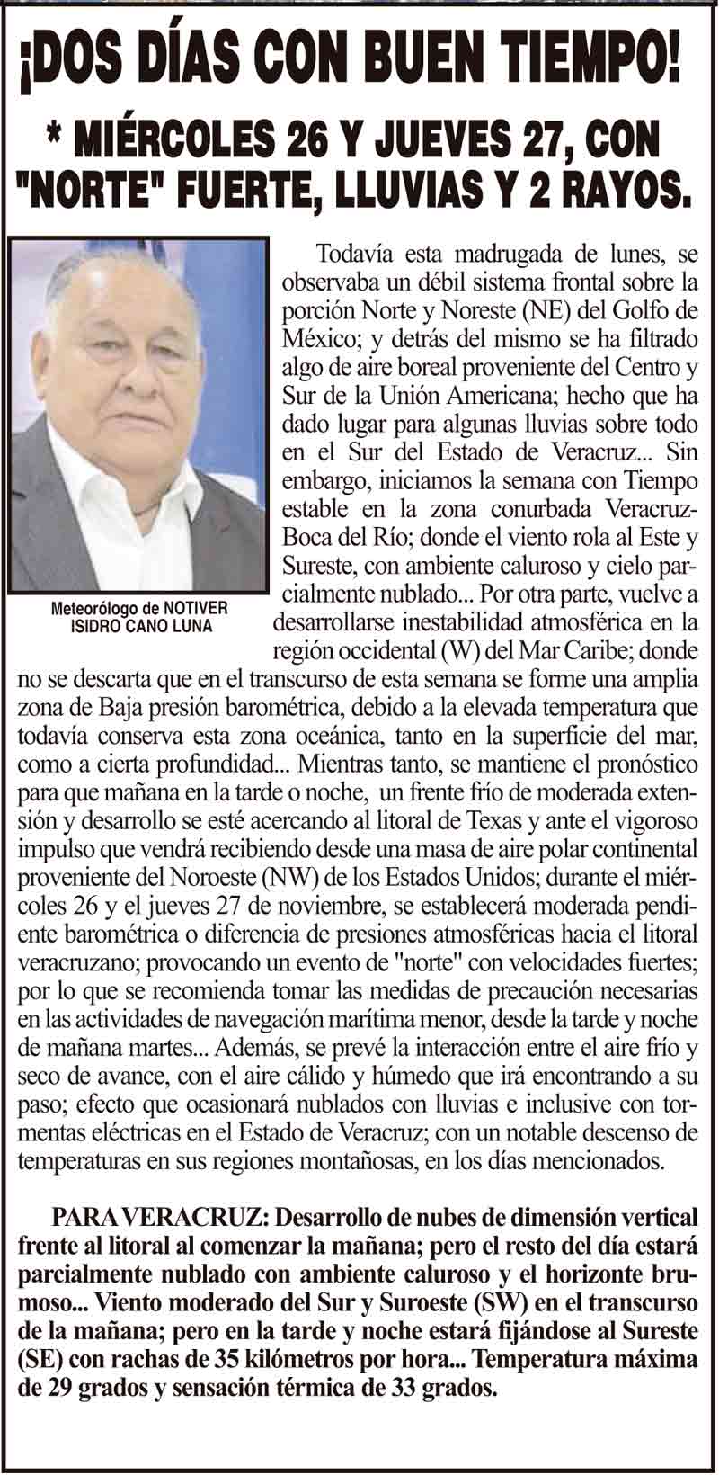 PRIMERA ¡DOS DÍAS CON BUEN TIEMPO! - *MIÉRCOLES 26 Y JUEVES 27, CON "NORTE" FUERTE, LLUVIAS Y 2 RAYOS. 24 noviembre 2025 Más Noticias LA ENCUESTA | - ME ESTÁS OYENDO INÚTIL?... ¡CON BAILONGOS QUIEREN AYUDAR A LOS DAMNIFICADOS DEL NORTE! - *El mismo Alor, toca los timbales ¡YA SE LA APROBARON! - REFORMA PARA LA FISCALÍA ESTATAL NOTI-MEME | - ASÍ ESTUVO EL INFORME... ¡MÁS DE 9 MIL MILLONES! - *Eso costaría cancelar en Veracruz al Grupo MAS ¡LE DAN LUZ VERDE! - DESDE GUATEMALA ¡EL CUARTO! ¡Y COM-PA-RE-CIÓ! - ÁNDALE... ¡NO SE VA LISBETH AURELIA! - *Descarta ir a la Fiscalía y que seguirá como magistrada ¡CREAN EL SÚPER MAÍZ!