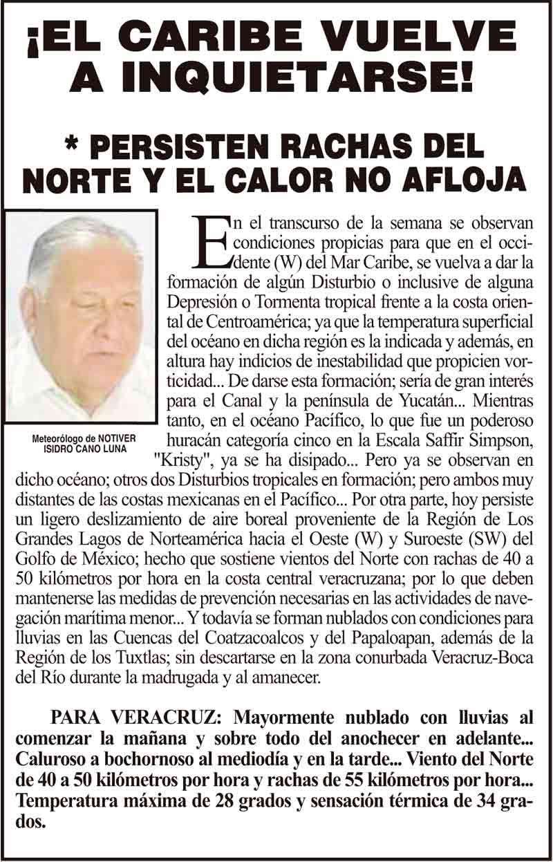 PRIMERA ¡EL CARIBE VUELVE A INQUIETARSE! - *PERSISTEN RACHAS DEL NORTE Y EL CALOR NO AFLOJA 28 octubre 2024 Más Noticias ¡YA HAY TERNA! - RAÚL PEIMBERT EN LA LISTA ¡“CEMENTERIO”! - DE ULÚAS ¡INAUGURA PATY OTRA CALLE! ¡NO LE CREYERON! - Y LO BUSCAN NOTI-MEME | - ECOS DEL INFORME! ¡VERÓNICA VA CON NAHLE! - Y AL CONGRESO ¡“FAST TRACK”! - *Mientras el Mariner salía y entraba de Pajaritos en Coatzacoalcos ¡OPERATIVO LUPE-REYES! ¡MANDAN LA BILLETIZA! - *Corea manda 150 mil dólares ¡CRISTINA GANA LA ELECCIÓN!