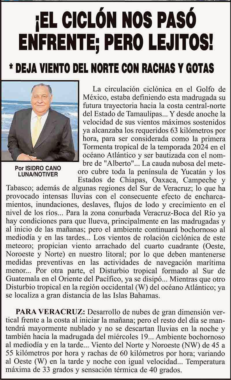 PRIMERA ¡EL CICLÓN NOS PASÓ ENFRENTE; PERO LEJITOS! - *DEJA VIENTO DEL NORTE CON RACHAS Y GOTAS 18 junio 2024 Más Noticias ¡YA HAY TERNA! - RAÚL PEIMBERT EN LA LISTA ¡“CEMENTERIO”! - DE ULÚAS ¡INAUGURA PATY OTRA CALLE! ¡NO LE CREYERON! - Y LO BUSCAN NOTI-MEME | - ECOS DEL INFORME! ¡VERÓNICA VA CON NAHLE! - Y AL CONGRESO ¡“FAST TRACK”! - *Mientras el Mariner salía y entraba de Pajaritos en Coatzacoalcos ¡OPERATIVO LUPE-REYES! ¡MANDAN LA BILLETIZA! - *Corea manda 150 mil dólares ¡CRISTINA GANA LA ELECCIÓN!