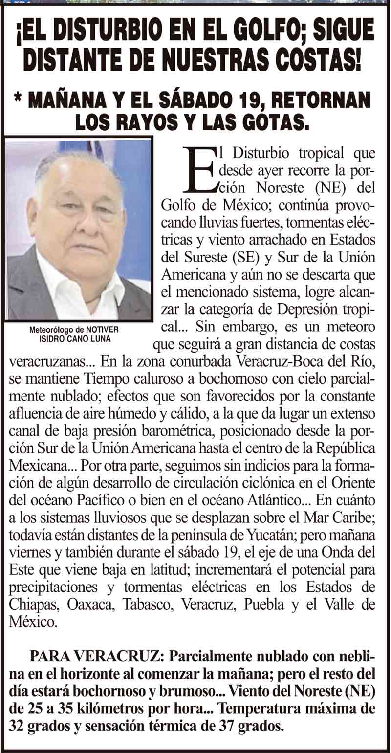 PRIMERA ¡EL DISTURBIO EN EL GOLFO; SIGUE DISTANTE DE NUESTRAS COSTAS! - *MAÑANA Y EL SÁBADO 19, RETORNAN LOS RAYOS Y LAS GOTAS. 17 julio 2025 Más Noticias LA PORTADA - VIERNES 5 DE DICIEMBRE 2025 ¡HOY SOPLA FRESCO Y DE FRENTE! - *PERO EL LUNES 8, ESTARÁ FUERTE Y CON LLUVIAS. LA ENCUESTA | - ME ESTÁS OYENDO INÚTIL?... ¡CON BAILONGOS QUIEREN AYUDAR A LOS DAMNIFICADOS DEL NORTE! - *El mismo Alor, toca los timbales ¡YA SE LA APROBARON! - REFORMA PARA LA FISCALÍA ESTATAL NOTI-MEME | - ASÍ ESTUVO EL INFORME... ¡MÁS DE 9 MIL MILLONES! - *Eso costaría cancelar en Veracruz al Grupo MAS ¡LE DAN LUZ VERDE! - DESDE GUATEMALA ¡EL CUARTO! ¡Y COM-PA-RE-CIÓ! - ÁNDALE...