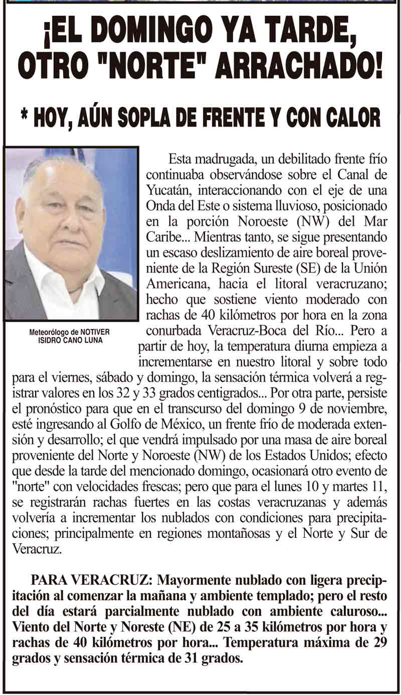 PRIMERA ¡EL DOMINGO YA TARDE, OTRO "NORTE" ARRACHADO! - *HOY, AÚN SOPLA DE FRENTE Y CON CALOR 5 noviembre 2025 Más Noticias LA ENCUESTA | - ME ESTÁS OYENDO INÚTIL?... ¡CON BAILONGOS QUIEREN AYUDAR A LOS DAMNIFICADOS DEL NORTE! - *El mismo Alor, toca los timbales ¡YA SE LA APROBARON! - REFORMA PARA LA FISCALÍA ESTATAL NOTI-MEME | - ASÍ ESTUVO EL INFORME... ¡MÁS DE 9 MIL MILLONES! - *Eso costaría cancelar en Veracruz al Grupo MAS ¡LE DAN LUZ VERDE! - DESDE GUATEMALA ¡EL CUARTO! ¡Y COM-PA-RE-CIÓ! - ÁNDALE... ¡NO SE VA LISBETH AURELIA! - *Descarta ir a la Fiscalía y que seguirá como magistrada ¡CREAN EL SÚPER MAÍZ!