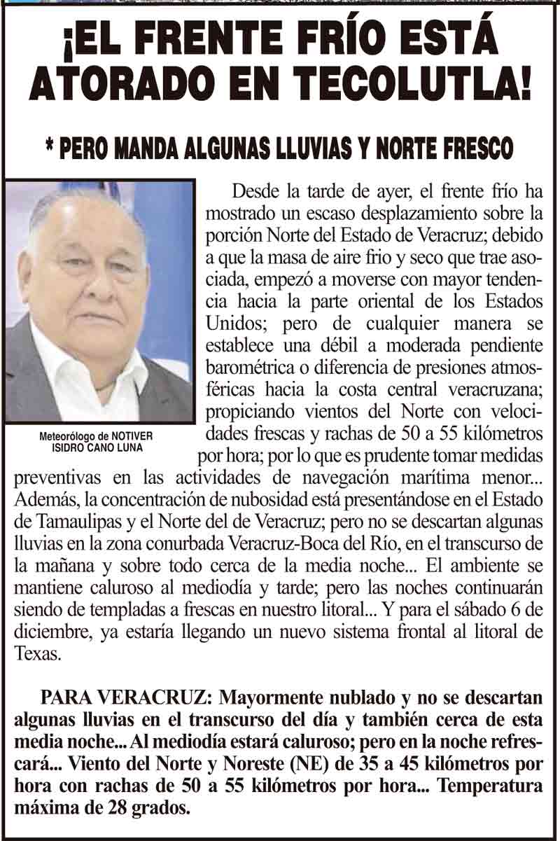 PRIMERA ¡EL FRENTE FRÍO ESTÁ ATORADO EN TECOLUTLA! - *PERO MANDA ALGUNAS LLUVIAS Y NORTE FRESCO 2 diciembre 2025 Más Noticias LA ENCUESTA | - ME ESTÁS OYENDO INÚTIL?... ¡CON BAILONGOS QUIEREN AYUDAR A LOS DAMNIFICADOS DEL NORTE! - *El mismo Alor, toca los timbales ¡YA SE LA APROBARON! - REFORMA PARA LA FISCALÍA ESTATAL NOTI-MEME | - ASÍ ESTUVO EL INFORME... ¡MÁS DE 9 MIL MILLONES! - *Eso costaría cancelar en Veracruz al Grupo MAS ¡LE DAN LUZ VERDE! - DESDE GUATEMALA ¡EL CUARTO! ¡Y COM-PA-RE-CIÓ! - ÁNDALE... ¡NO SE VA LISBETH AURELIA! - *Descarta ir a la Fiscalía y que seguirá como magistrada ¡CREAN EL SÚPER MAÍZ!