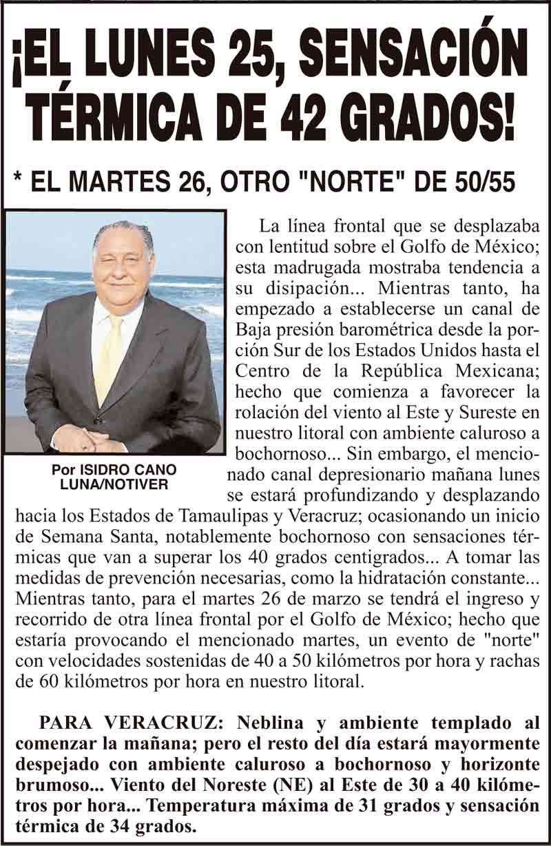 PRIMERA ¡EL LUNES 25, SENSACIÓN TÉRMICA DE 42 GRADOS! - * EL MARTES 26, OTRO "NORTE" DE 50/55 24 marzo 2024 Más Noticias ¡YA HAY TERNA! - RAÚL PEIMBERT EN LA LISTA ¡“CEMENTERIO”! - DE ULÚAS ¡INAUGURA PATY OTRA CALLE! ¡NO LE CREYERON! - Y LO BUSCAN NOTI-MEME | - ECOS DEL INFORME! ¡VERÓNICA VA CON NAHLE! - Y AL CONGRESO ¡“FAST TRACK”! - *Mientras el Mariner salía y entraba de Pajaritos en Coatzacoalcos ¡OPERATIVO LUPE-REYES! ¡MANDAN LA BILLETIZA! - *Corea manda 150 mil dólares ¡CRISTINA GANA LA ELECCIÓN!
