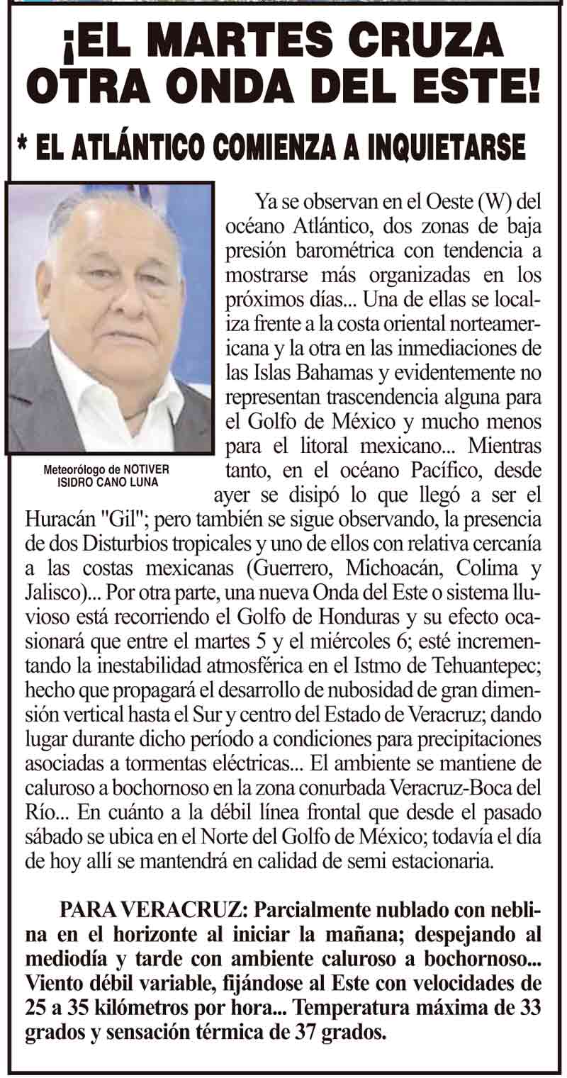 PRIMERA ¡EL MARTES CRUZA OTRA ONDA DEL ESTE! - *EL ATLÁNTICO COMIENZA A INQUIETARSE 4 agosto 2025 Más Noticias LA PORTADA - VIERNES 5 DE DICIEMBRE 2025 ¡HOY SOPLA FRESCO Y DE FRENTE! - *PERO EL LUNES 8, ESTARÁ FUERTE Y CON LLUVIAS. LA ENCUESTA | - ME ESTÁS OYENDO INÚTIL?... ¡CON BAILONGOS QUIEREN AYUDAR A LOS DAMNIFICADOS DEL NORTE! - *El mismo Alor, toca los timbales ¡YA SE LA APROBARON! - REFORMA PARA LA FISCALÍA ESTATAL NOTI-MEME | - ASÍ ESTUVO EL INFORME... ¡MÁS DE 9 MIL MILLONES! - *Eso costaría cancelar en Veracruz al Grupo MAS ¡LE DAN LUZ VERDE! - DESDE GUATEMALA ¡EL CUARTO! ¡Y COM-PA-RE-CIÓ! - ÁNDALE...
