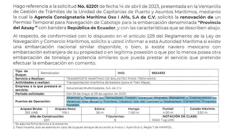 En la comunicación que tuvieron las dos oficinas mencionadas se especificó que si existía otro naviero mexicano disponible con las suficientes características de tonelaje y potencia, para prestar el servicio, como argumento de inclusión de este remolcador.