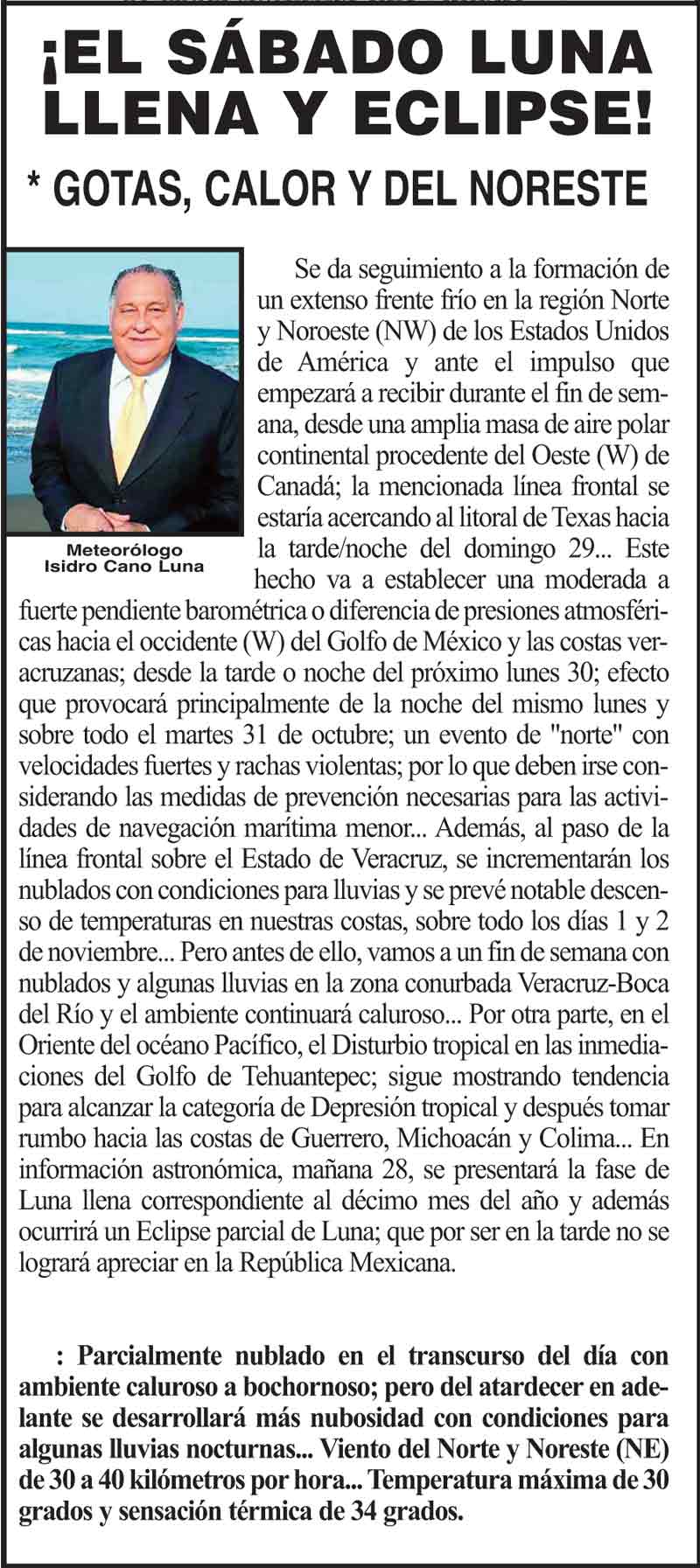 PRIMERA ¡EL SÁBADO LUNA LLENA Y ECLIPSE! * GOTAS, CALOR Y DEL NORESTE 27 octubre 2023 Más Noticias ¡YA HAY TERNA! - RAÚL PEIMBERT EN LA LISTA ¡“CEMENTERIO”! - DE ULÚAS ¡INAUGURA PATY OTRA CALLE! ¡NO LE CREYERON! - Y LO BUSCAN NOTI-MEME | - ECOS DEL INFORME! ¡VERÓNICA VA CON NAHLE! - Y AL CONGRESO ¡“FAST TRACK”! - *Mientras el Mariner salía y entraba de Pajaritos en Coatzacoalcos ¡OPERATIVO LUPE-REYES! ¡MANDAN LA BILLETIZA! - *Corea manda 150 mil dólares ¡CRISTINA GANA LA ELECCIÓN!
