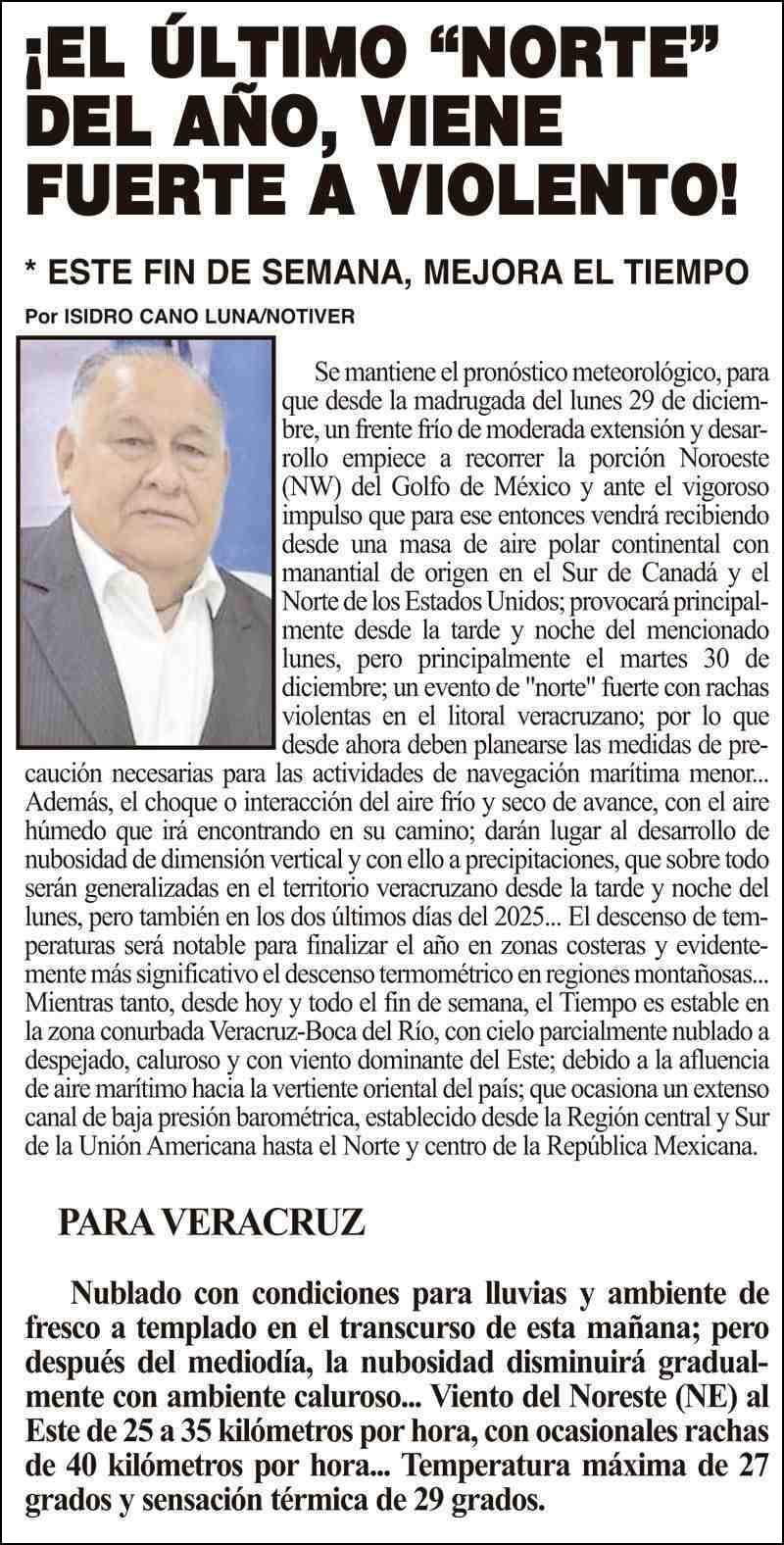 PRIMERA ¡EL ÚLTIMO “NORTE” DEL AÑO, VIENE FUERTE A VIOLENTO! - *ESTE FIN DE SEMANA, MEJORA EL TIEMPO 26 diciembre 2025 Más Noticias NOTI-MEME | - LA MAESTRA MÁS BUENA DE VERACRUZ ¡SACAN LIBRO “PROHIBIDO”! - “NI VENGANZA, NI PERDÓN” ¡PEGA TUBERCULOSIS! - LO QUE FALTABA ¡CARNAVALES AFROMESTIZOS! ¡MUEVEN CUMBRE CLAUDIA Y SALMA! - A CDMX ¡SE FUE A LA GRACIANO SÁNCHEZ! ¡VA BLANCO EL CARNAVAL! - *Eso dice el director de Turismo y Carnaval ¡‘PARAN’ EL PUERTO! - POR EL CARNAVAL ¡VIENEN LOS MARINES! - SIEMPRE SI ¡YA SON 21! - *Casos de sarampión